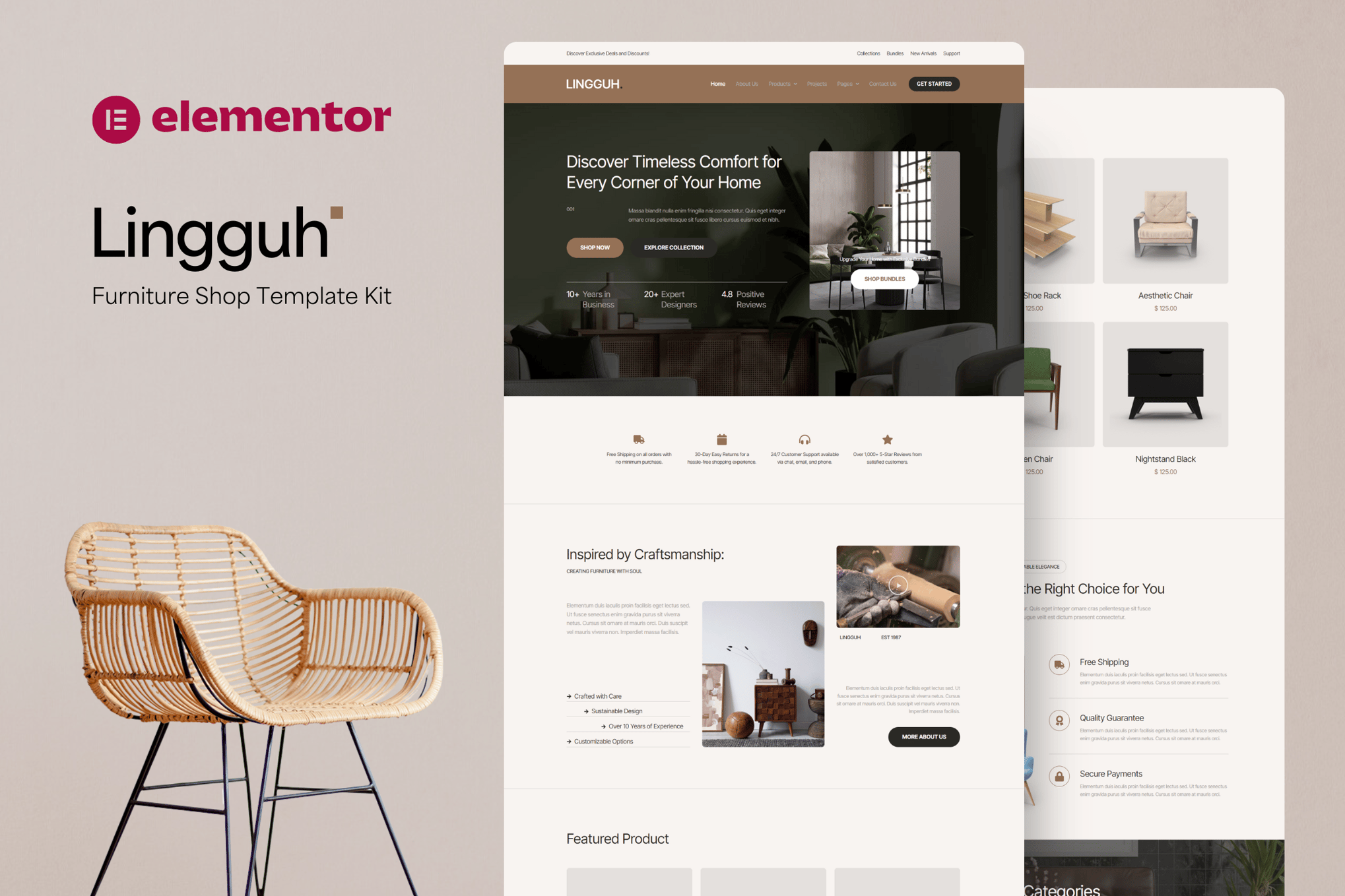TheLingguh – Furniture Ecommerce Website Template is a professional Elementor Kit designed for furniture and home decor businesses. It features a sleek and modern design optimized for showcasing products, with clean typography and high-quality imagery. This template is fully responsive and customizable, compatible with WooCommerce for easy online store management. Key features include no-code customization, pricing tables, product filters, detailed product descriptions, and fast loading times. Ideal for launching or revamping online furniture stores.
