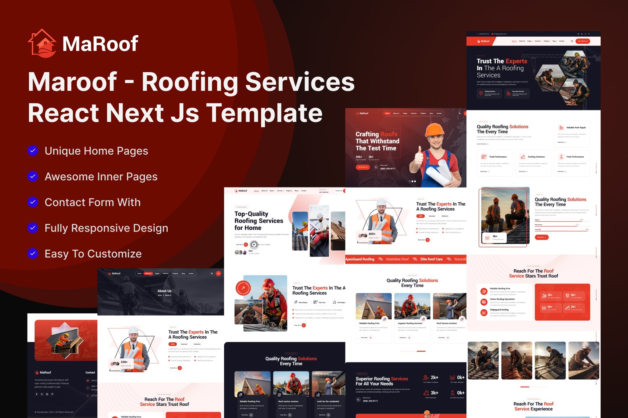 Introducing Maroof – a top-notch React Next Js template tailored for roofing services, construction, and more. With a plethora of features like industrial roofing, installation, repair, and maintenance services, Maroof stands out as a comprehensive roofing solution. The template boasts a sleek design with 04 homepage layouts, 20+ PHP files, and full responsiveness. It is built on Bootstrap 5.x, ensuring a modern and clean look that is easy to customize. Other highlights include SEO optimization, Google Maps integration, and 24/7 support. With Maroof, you get a fully-equipped template that is perfect for any roofing company looking to enhance their online presence.
