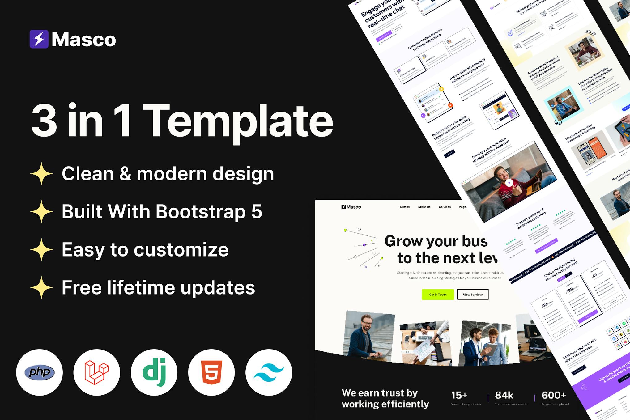 Masco is a versatile multipurpose template designed for Django, Laravel, and PHP projects. With a sleek and modern design, this template offers a range of features suitable for a variety of web applications. Its flexibility and ease of customization make it perfect for developers looking to create stunning websites with minimal effort. The template includes multiple layouts, components, and pages to help speed up the development process. Whether you are building a corporate website, a portfolio, or an e-commerce platform, Masco provides the tools you need to make your project a success.
