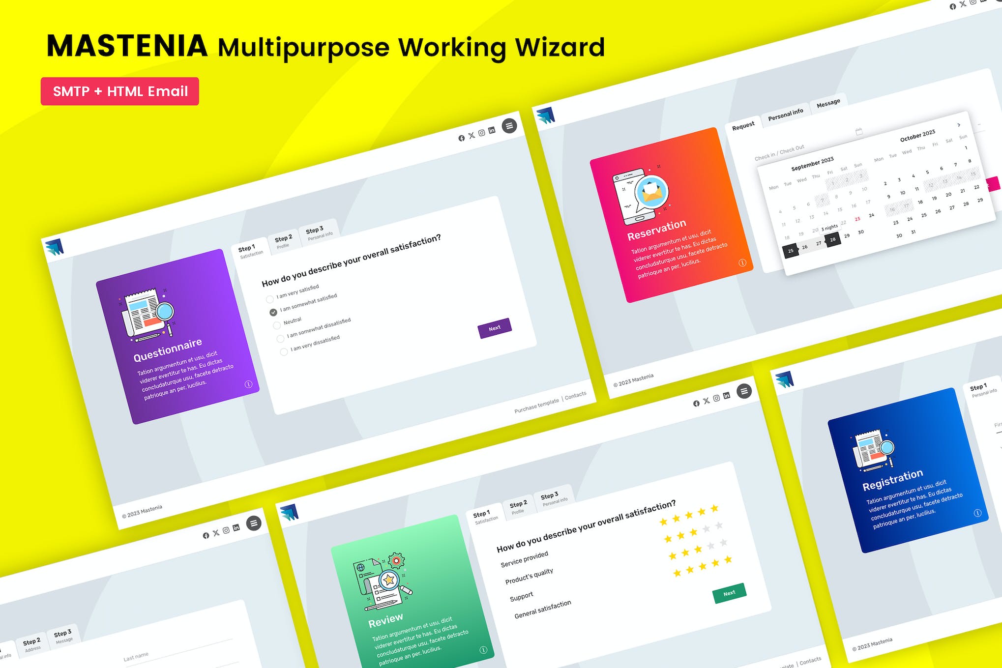 Introducing MASTENIA Registration, Reservation, Questionnaire, and Reviews Wizard, a versatile tool for companies to engage new customers and gather valuable data effortlessly. Featuring a sleek design with intuitive form elements such as radio buttons, checkboxes, and dropdowns, this tool ensures a seamless user experience. With multiple demo versions and color schemes, it’s easy to customize to suit your brand. The included PHP forms with anti-spam protection and autoresponder, along with email notifications, make managing submissions a breeze. Upgrade your customer interaction with MASTENIA Wizard.