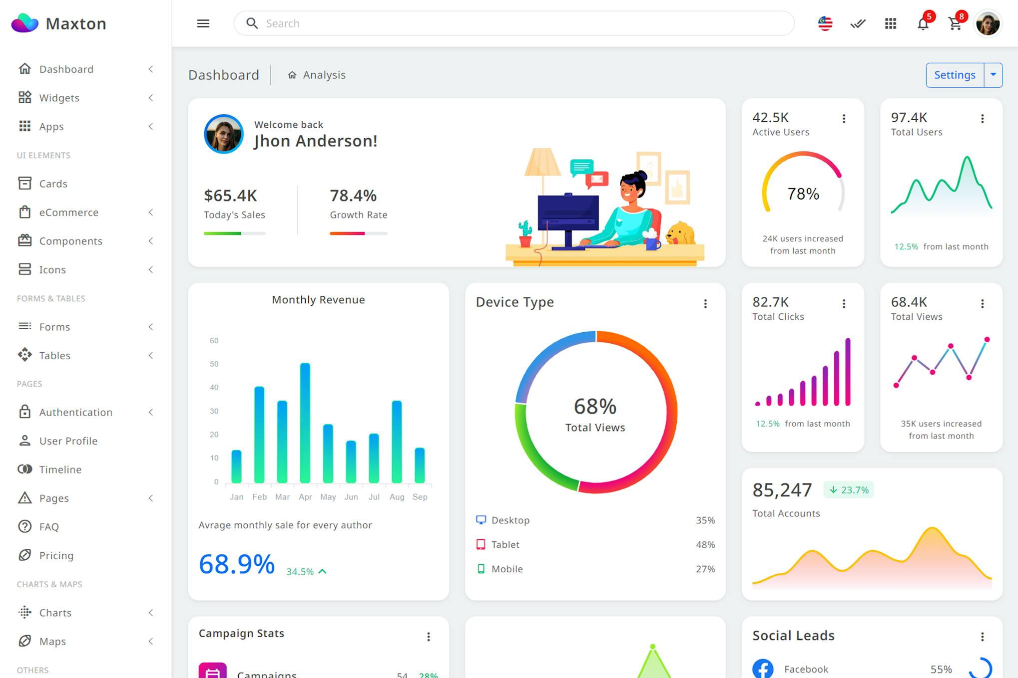 The Maxton Laravel 11 Yii Codeignitor Admin Dashboard is a versatile and comprehensive admin dashboard template designed for web developers. It features a clean and modern design with a wide range of components and elements that make it easy to customize and adapt to different projects. This template is built with popular technologies such as Laravel, Yii, and Codeigniter, ensuring high performance and reliability. It offers a variety of dashboards, pages, and UI elements that help developers quickly set up and manage their admin interfaces. With its responsive design and rich features, the Maxton Admin Dashboard is a valuable tool for building professional and user-friendly web applications.