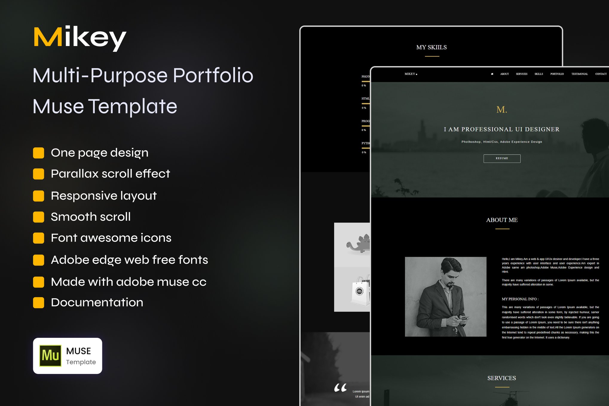 Download MIKEY – the ultimate Multi-Purpose Portfolio Muse Template! Designed with a sleek and modern aesthetic, this responsive one-page template created with Adobe Muse CC is perfect for showcasing personal portfolios, agencies, freelancers, and more. Experience seamless navigation with parallax scroll effects, a responsive layout, and smooth scrolls. Elevate your website with Font Awesome icons and Adobe Edge web free fonts. Easily customizable with Adobe Muse CC, MIKEY includes detailed documentation for a hassle-free setup. Enhance your online presence with this versatile template – perfect for creatives, professionals, and businesses alike!