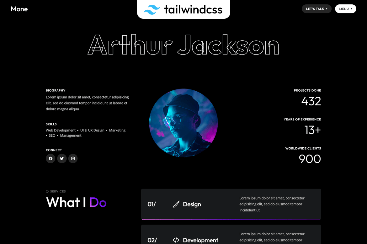 Introducing Moneis, a sleek Personal Portfolio template designed for those looking to showcase their work in style. Built with Tailwind CSS, this template boasts a fully responsive layout and modern dark design. With features like a header toggle menu, lightbox media, and a portfolio slider, your website will stand out effortlessly. The template also includes a contact form, Google Maps integration, and detailed documentation for ease of use. Enjoy the benefits of high performance, 2,000 font icons, and lifetime free updates. Elevate your online presence with Moneis and make a lasting impression.