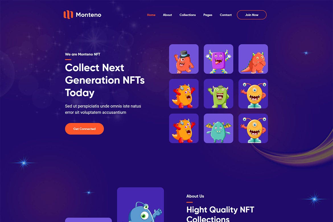 Enhance your NFT portfolio with Monteno, a sophisticated Tailwind CSS template designed for blockchain NFT, collectibles, and crypto assets. This versatile template enables you to effortlessly create an online marketplace to buy, sell, trade, and auction NFT items in the gaming industry. With its responsive design, customization options, and sleek features like Ajax Contact Form and Parallax Effect, Monteno empowers you to showcase your digital assets professionally and efficiently. Elevate your online presence and captivate your audience with Monteno’s clean design and unlimited color choices.