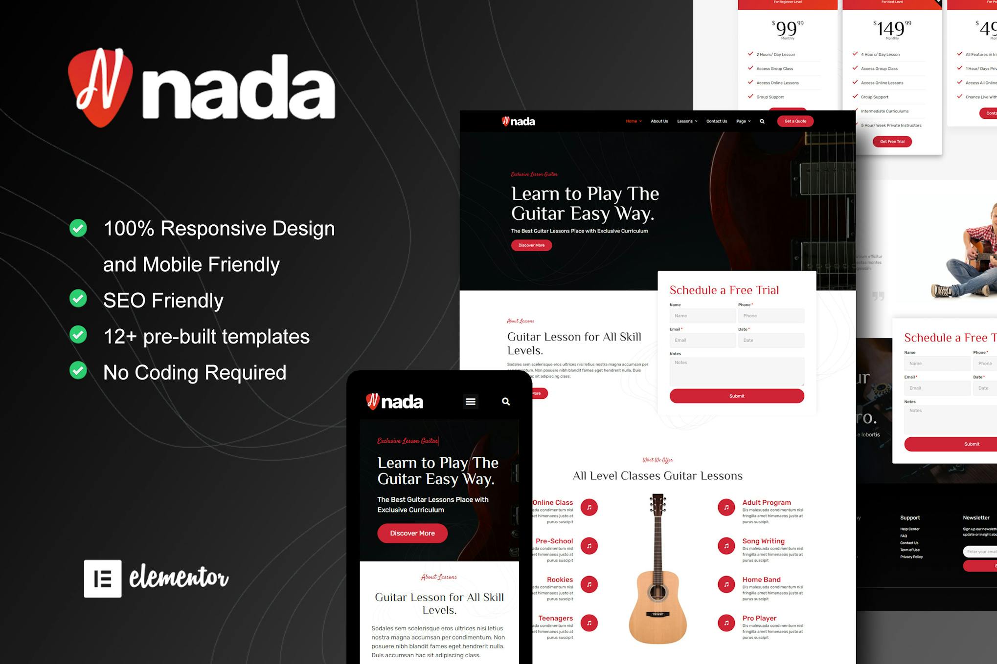 Introducing Nada – the ultimate Elementor Template Kit for guitar lessons and courses. With a sleek modern layout and clean design, this template is perfect for businesses offering musical courses, especially guitar lessons. Easily create a professional website for guitar lessons with the drag and drop feature, no coding skills required. The kit includes 12+ pre-built templates such as Homepage, About Us, Blog, Contact Us, Instructors, Lessons, and more. Built with Elementor Pro, the templates are 100% responsive and mobile-friendly, ensuring a seamless user experience. Enhance your website with required plugins like Prime Slider, ElementsKit Lite, and Premium Addons for Elementor. Elevate your online presence today with Nada Elementor Template Kit.