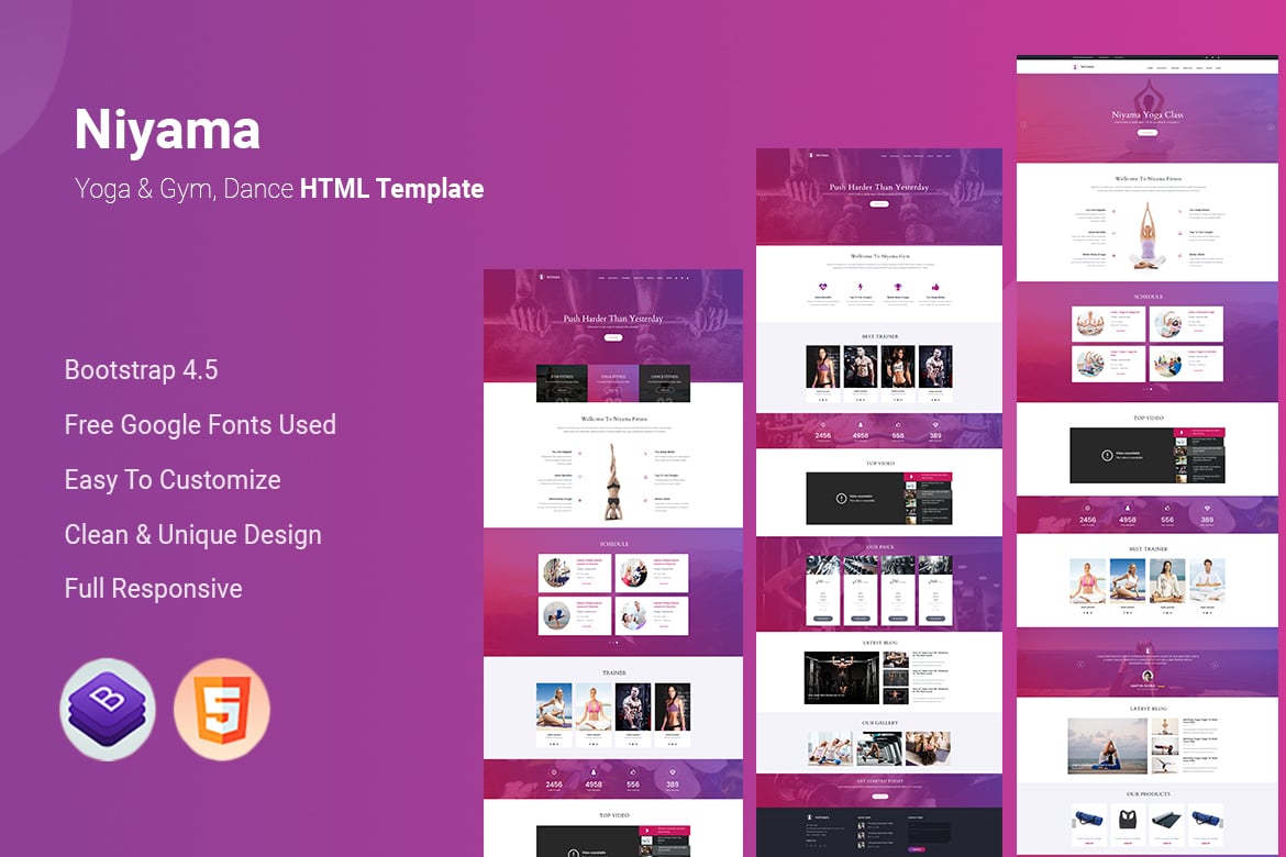 Introducing the “Niyama | Multipurpose Yoga & Gym, Dance PSD Templates,” a premium HTML template designed for yoga, health, gym, dance, and meditation websites. With a creative and modern design, it offers one page and multi-page layouts, making it versatile for various businesses in the wellness industry. The template is fully responsive and built on Bootstrap 4, ensuring a seamless user experience across devices. It includes 13 home pages, 12 inner pages, captivating animations, and over 360 icons, all crafted with HTML5 and CSS3. Easy to customize and featuring clean design elements, Niyama is tailored for yoga, dance, and gym businesses, providing a professional and visually appealing online presence.