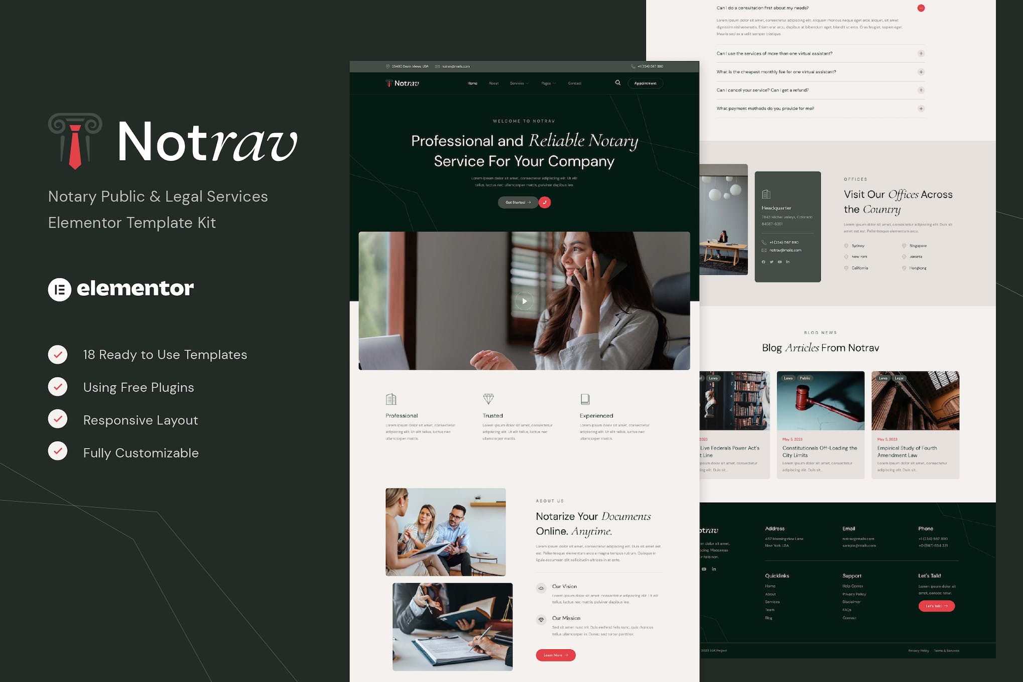 Introducing Notrav – Notary Public & Legal Services Elementor Template Kit, designed specifically for professionals in the consulting, Notary Public Services, legal advisor, lawyer, or any legal services field. With a sleek and modern design, this template kit offers a fully responsive layout that is easy to customize without any coding knowledge. It includes 13 pages and 18 stunning templates, allowing you to effortlessly create a professional-looking website. Compatible with popular browsers such as Chrome, Firefox, Safari, and Opera, Notrav is the perfect solution for creating a visually appealing and functional online presence for your legal services.