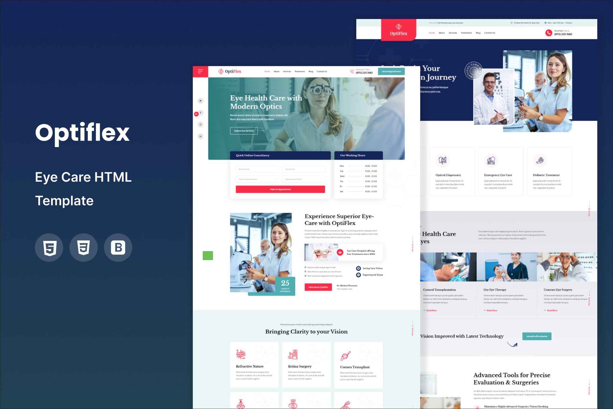 The Optiflex Eye Care optometrist HTML template is a modern and responsive design tailored specifically for optometrists and eye clinics. Created with extensive research and understanding of the requirements of such medical professionals, this template is packed with all the necessary features for a comprehensive and user-friendly website. The design is not only visually appealing but also follows the latest trends in web development. Additionally, the template offers flexibility by accepting requests for new page versions, ensuring that optometrists can customize their online presence to best suit their needs.