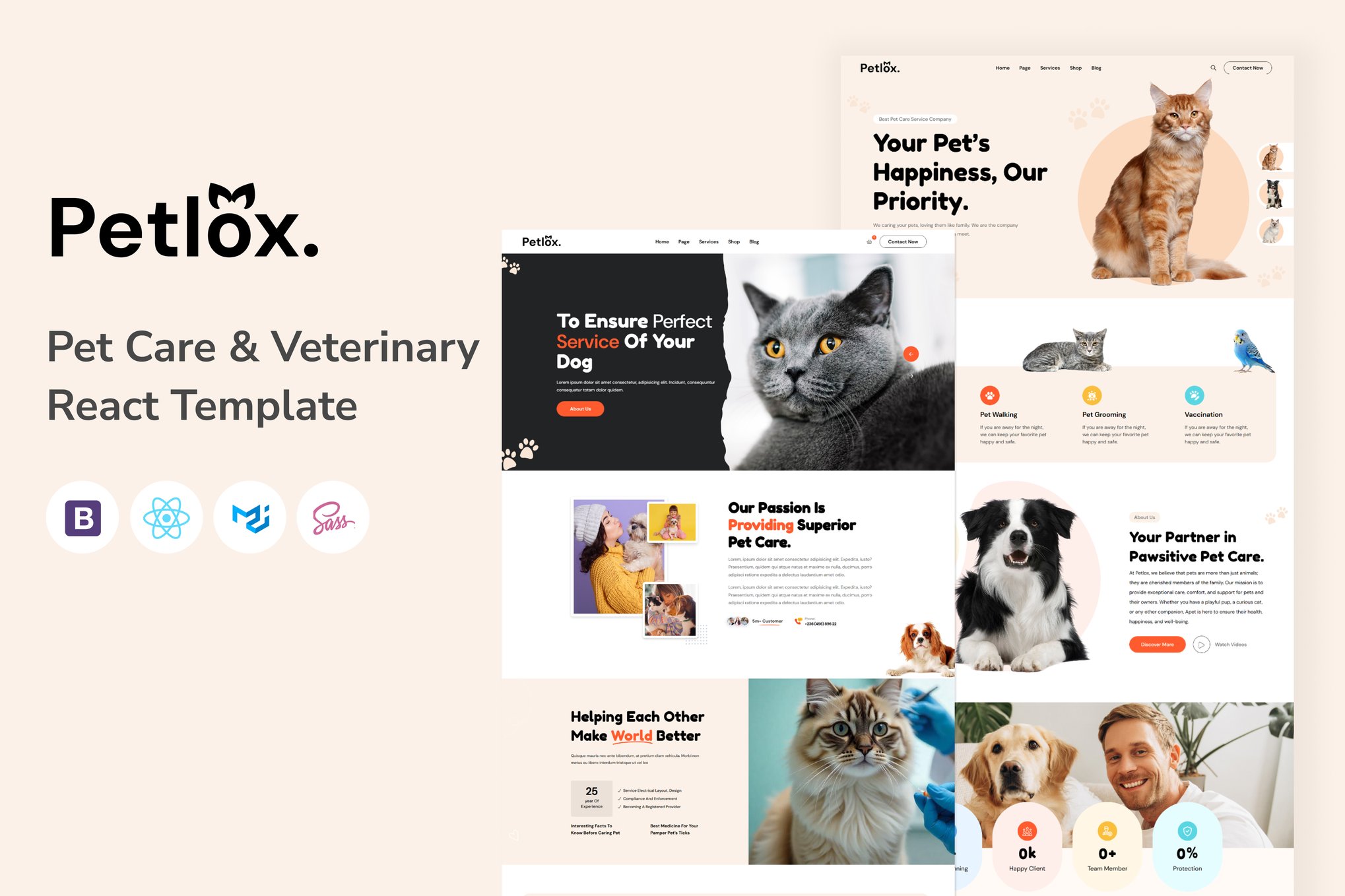 Introducing Petlox | Pet Care & Veterinary React Template, a sophisticated and contemporary design tailored for all aspects of animal care. Ideal for pet stores, pet hotels, grooming services, and more, this template boasts 100% W3C validated and well-structured code, with complete shop pages included. Built on Bootstrap 5, the React files are fully customizable, with a responsive layout and essential features like team profiles, services showcase, and blog integration. With support from our expert team and extensive documentation, Petlox is a versatile solution for pet care websites.
