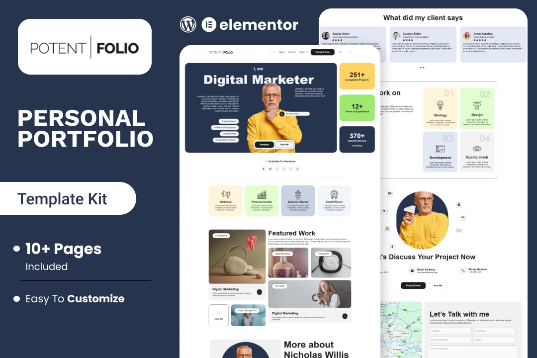 Introducing PotentFolio, the ultimate Elementor template kit tailor-made for digital marketers, freelancers, and growth strategists seeking to elevate their online presence. With sleek designs, captivating animations, and strategic content areas, PotentFolio empowers you to showcase your achievements and personal brand effectively. From presenting case studies to highlighting testimonials and services, this responsive and customizable kit is a game-changer. Ideal for SEO experts, social media managers, and branding gurus, PotentFolio ensures a memorable first impression that positions you as a results-driven professional. Stand out effortlessly with PotentFolio!