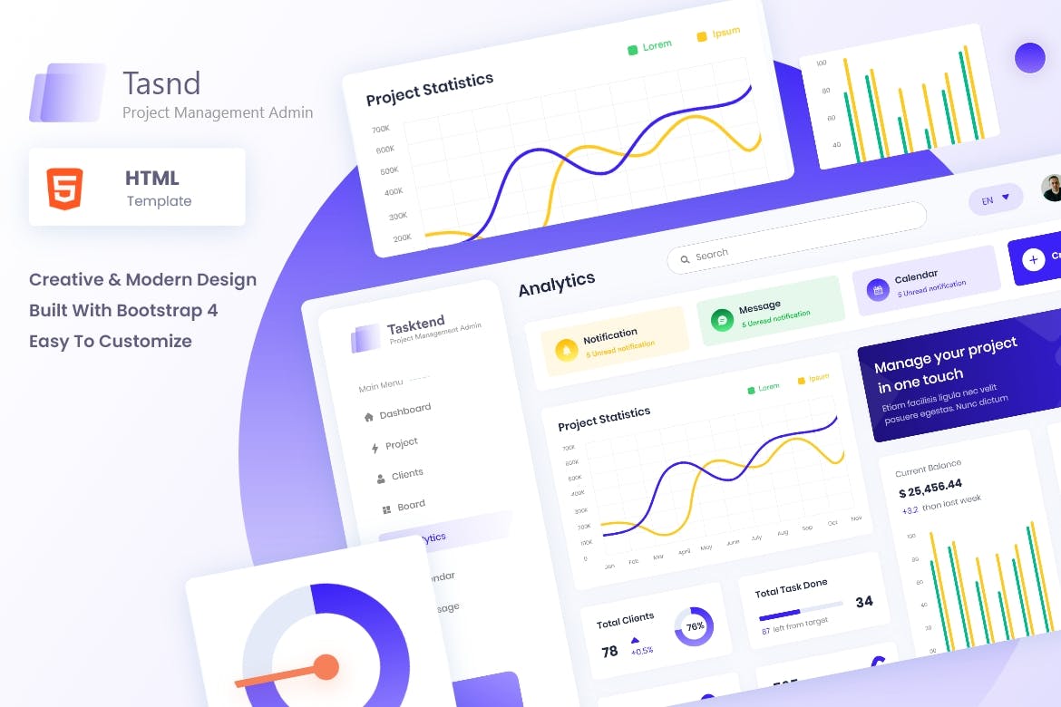 Protend – Project Management Admin Dashboard HTML is a highly efficient and user-friendly tool designed to streamline project management tasks. With its sleek design and intuitive interface, it offers a comprehensive set of features such as task tracking, team collaboration, and progress monitoring. Whether you are a freelancer, small business owner, or part of a larger organization, Protend ensures seamless project coordination.