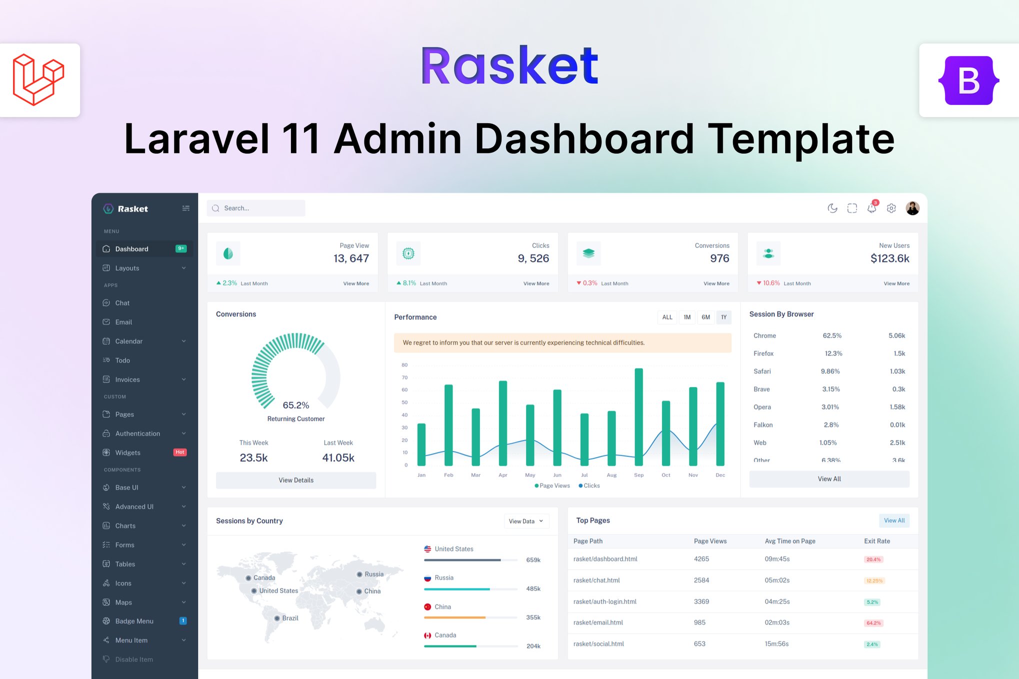 Download the RasketisLaravel 11 & Bootstrap 5 Admin & Dashboard Template, a premium UI Kit packed with Bootstrap v5.3.3, PHP, SCSS, and JS technologies, wrapped in a modern brutalist design. This meticulously crafted kit offers endless customization possibilities, full responsiveness, and intuitive code for seamless web app development. Elevate your UX with Rasket’s captivating design and robust pre-built components for a smooth development journey. Featuring new design widgets, 5 layout options, and developer-friendly code for enhanced performance, this template is a game-changer. With 110+ pages, 400+ UI components, rich form options, and support for various apps and browsers, Rasket is your all-in-one solution.