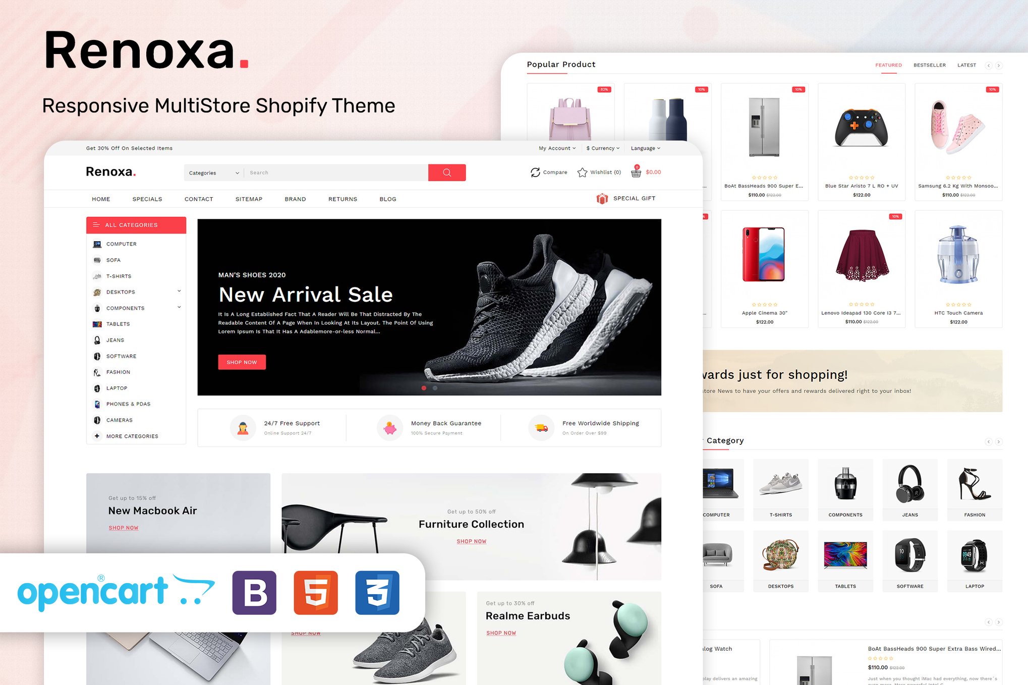Renoxa is a versatile Opencart Responsive theme that offers a pre-made layout with 100% responsiveness, ensuring a seamless user experience across all devices. This theme is packed with advanced functions, making it the most powerful OpenCart theme for multistore setups. With an attractive homepage slider, support for multi-language and multi-currency, as well as features like Ajax Quickview and Ajax Search, Renoxa provides a professional and clean look for any eCommerce website. It boasts a super-fast speed to enhance customer experiences and includes an Admin Panel for easy customization. Compatible with the latest version of OpenCart 3.x, Renoxa is ideal for e-commerce websites in various industries such as fashion, apparel, boutique, and more. The theme is easy to install and use, with features like Dynamic Layout, Cloudzoom, custom product pages, product image zoom, and a convenient product view. The theme also includes a megamenu, best selling featured products, a blog, and has a unique product detail design for a premium online shopping experience. Overall, Renoxa is a high-quality theme that caters to a wide range of e-commerce needs.