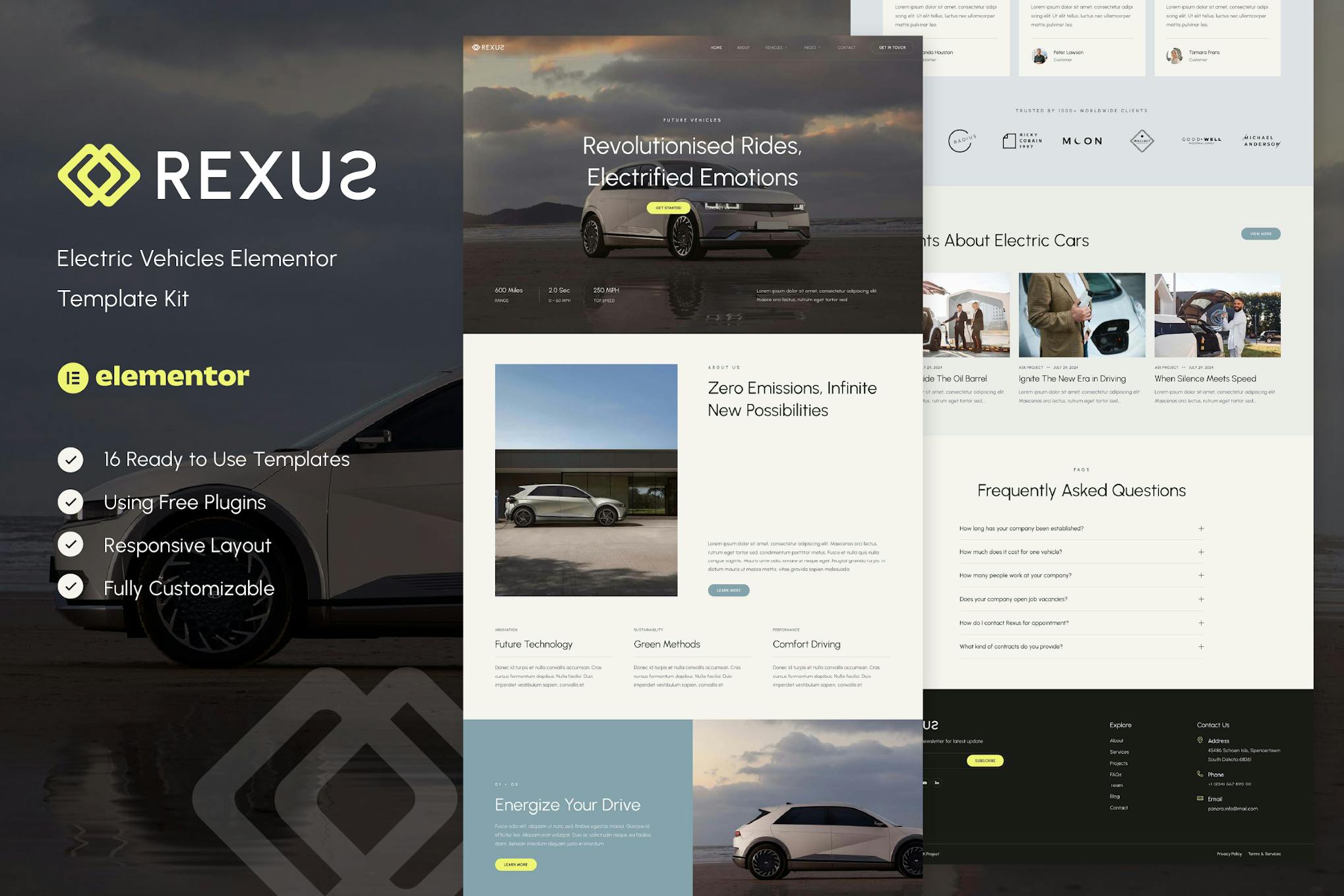 Rexus – Electric Vehicles Elementor Template Kit is a sleek and modern design specifically tailored for electric vehicle websites and businesses related to electric mobility. This template kit offers a user-friendly experience with 100% responsive layout and easy customization, making it accessible to all users regardless of coding knowledge. With 12 pre-designed pages and 16 templates, creating a professional-looking website is just a click away. Features include free Elementor usage, unique and clean design, fully customizable options, and compatibility with popular browsers. The kit also comes with templates for various pages such as Home, About, Vehicles, Reviews, FAQ, Blog, and more. In terms of installation, users can follow simple steps to set up the template kit seamlessly. Note that the kit uses demo images from Envato Elements, which require licensing for use on a live website. Overall, Rexus provides a comprehensive solution for showcasing electric vehicle services in a visually appealing and functional manner.