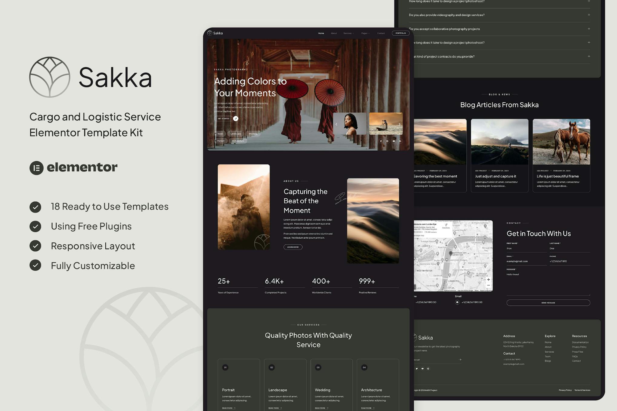 Sakka – Photography Service & Portfolio Elementor Template Kit is thoughtfully designed for professional photographers, photo bloggers, and photography agencies. With a sleek, modern layout and 100% responsive design, Sakka offers 14 pages and 18 stunning templates to effortlessly create a standout website. Featuring a unique and clean design, this kit is fully customizable without the need for coding knowledge. Compatible with popular browsers, Sakka allows users to showcase their portfolio, team, testimonials, services, pricing, and more. Installing this kit is a breeze with detailed instructions for seamless setup, making it a must-have tool for those looking to enhance their online presence in the photography industry.