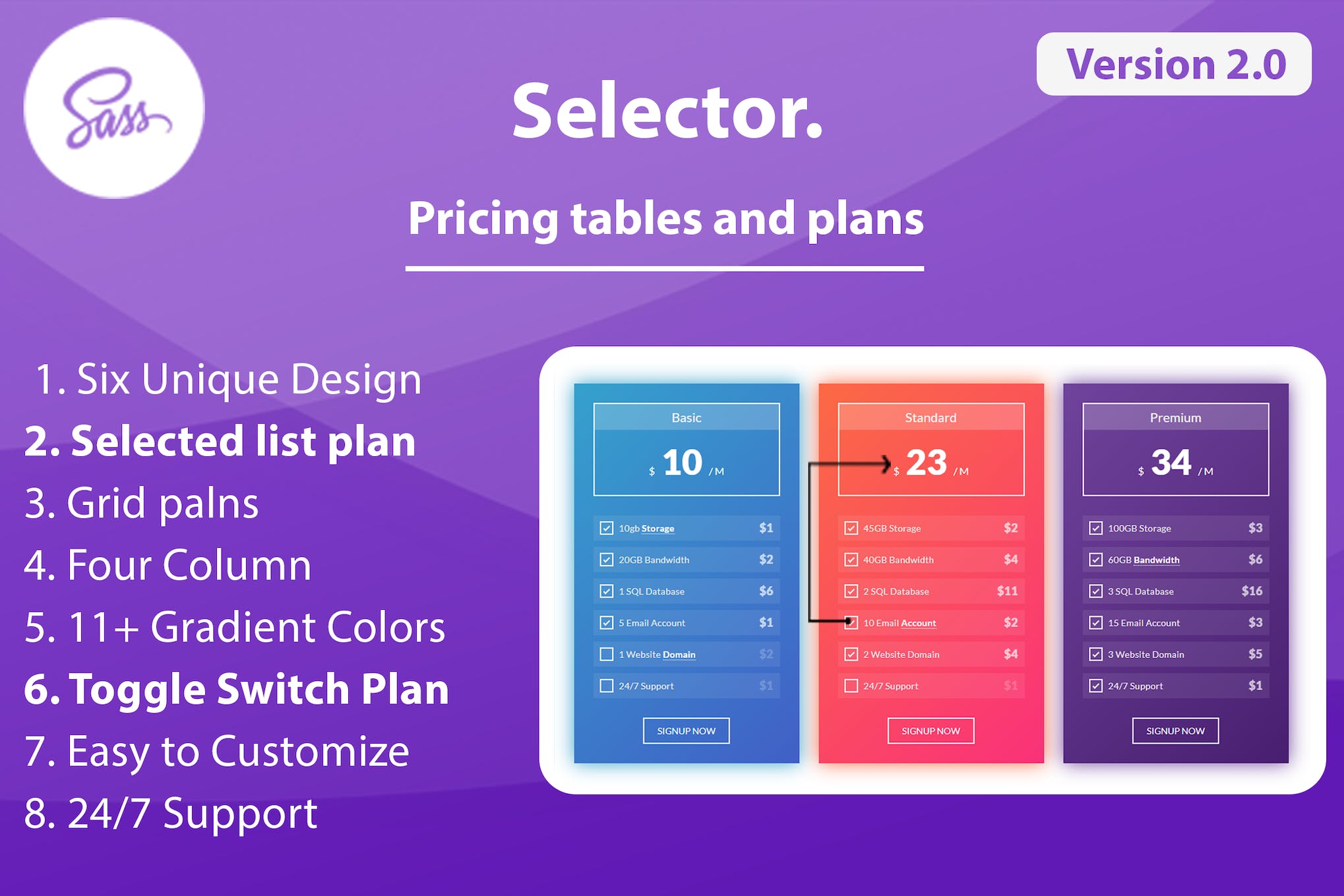 Experience ultimate pricing customization with Selector – Pricing Tables and Plans. This unique and advanced design, based on Bootstrap v4.5.1, offers 5 variations to perfectly suit your website’s aesthetic. Built with HTML5 and CSS3, it features SCSS integration, responsive design, and hover effects for a sleek, modern look. Easily set custom prices and toggle plans with the user-friendly interface. Backed by 24/7 friendly customer support, Selector ensures a seamless pricing experience for your website visitors.