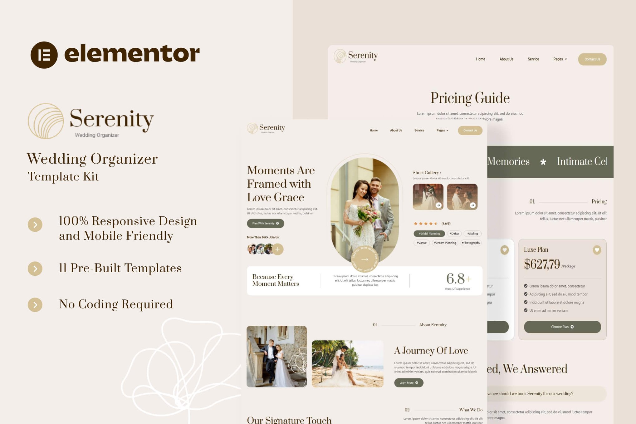 Step into a world of refinement with Serenity, the Elementor Template Kit tailored for wedding organizers and celebration planners. Elevate your events with elegance and ease, as this kit offers a seamless no-code customization experience. Crafted with free elements, Serenity provides a range of pages from Home to Contact Us, ensuring a comprehensive solution for all your needs. With a modern design and fast-loading performance, Serenity is the perfect companion for creating unforgettable moments. Dive into customization effortlessly with drag and drop features, and let your creativity flourish with this versatile and accessible template kit.
