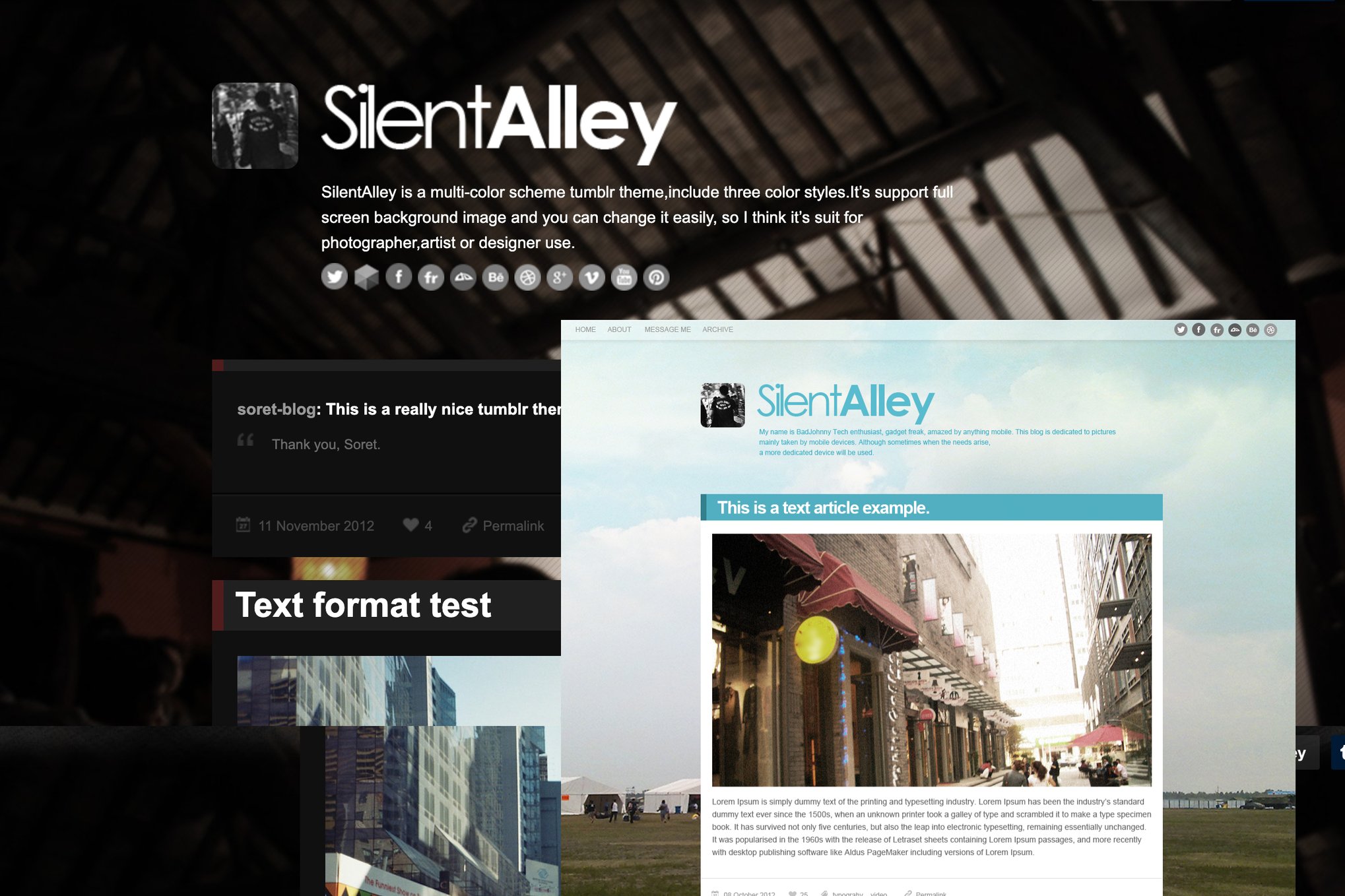 Download the Most-Wanted Winner theme on ThemeForest – SilentAlley! This vibrant Tumblr theme boasts a multi-color scheme with three captivating color styles to choose from. Perfect for photographers, artists, and designers, it offers full-screen background image support that can be effortlessly customized. Unleash your creativity with unlimited color options for links, article titles, and more. With responsive design, lightbox integration, Disqus comments, and PSD files included, SilentAlley is a versatile gem. Explore its endless customization possibilities and make it your own. Get ready to stand out with this sleek and user-friendly theme!