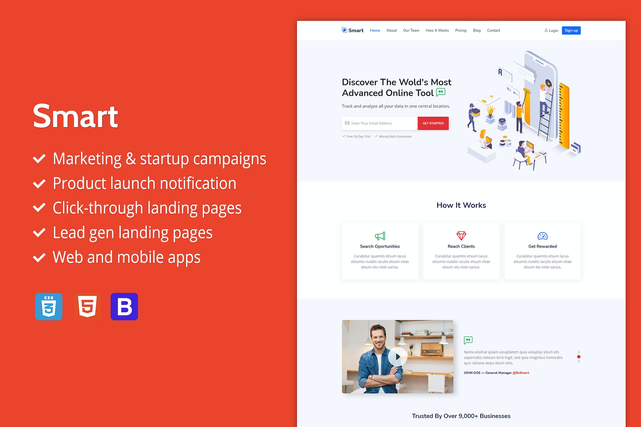 Enhance your online presence with Smart – a sleek and contemporary landing page template designed for optimal conversions. Built on Bootstrap 4.13, this template boasts a responsive layout, Retina-ready visuals, and cool animations to captivate your audience. Seamlessly promote SaaS startups, mobile apps, and web apps with ease while enjoying features like cross-browser compatibility, Google Fonts, and a user-friendly setup. Ideal for marketing campaigns, product launches, lead generation, and web/mobile applications, Smart is your go-to solution for professional and high-performing landing pages.