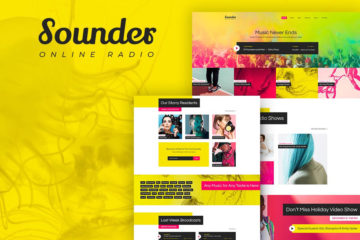Introducing Sounder, a vibrant and contemporary WordPress theme designed for online radio stations, music bands, DJs, artists, and entertainment businesses. With its three homepage layouts, Sounder allows you to showcase DJ compilations, radio hits, discography services, and upcoming music events. The theme features stunning photo and video galleries, making it perfect for music producers, musicians, and industry bloggers. Sounder is fully responsive and Retina Ready, ensuring your website looks amazing on any platform. It also comes equipped with premium plugins such as Essential Grid and WPBakery Page Builder for easy setup and operation. Elevate your online radio experience with Sounder’s advanced features, including online radio streaming, schedule timetable, shows and broadcasts management, and customizable galleries, sliders, and audio players.