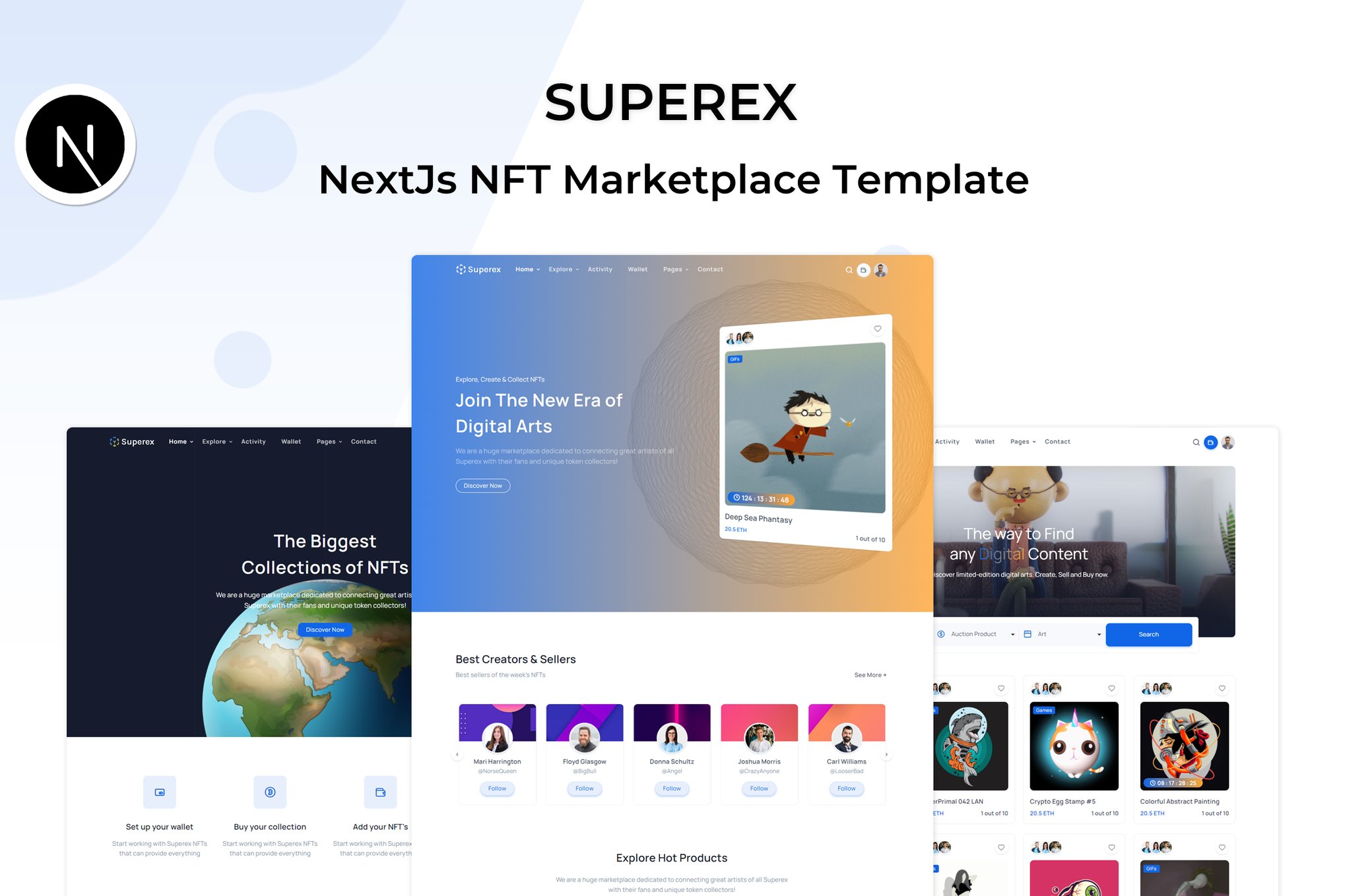 Introducing Superex, a powerful React NextJs NFTs marketplace template designed to revolutionize the world of digital collectibles. This fully responsive and pixel-perfect template offers a complete solution for NFTs, crypto-collectibles, and digital items websites, seamlessly integrating MetaMask for enhanced functionality. Superex is built on Next.js and React, featuring the latest Bootstrap framework without any jQuery dependencies. With customizable Light and Dark modes, RTL and LTR versions, and a plethora of icons and Google fonts to choose from, Superex ensures a personalized and modern website tailored to your needs. Easy to navigate and customize, this template also includes a range of pre-designed pages covering various aspects of NFT marketplace operations. Upgrade your online presence effortlessly with Superex.