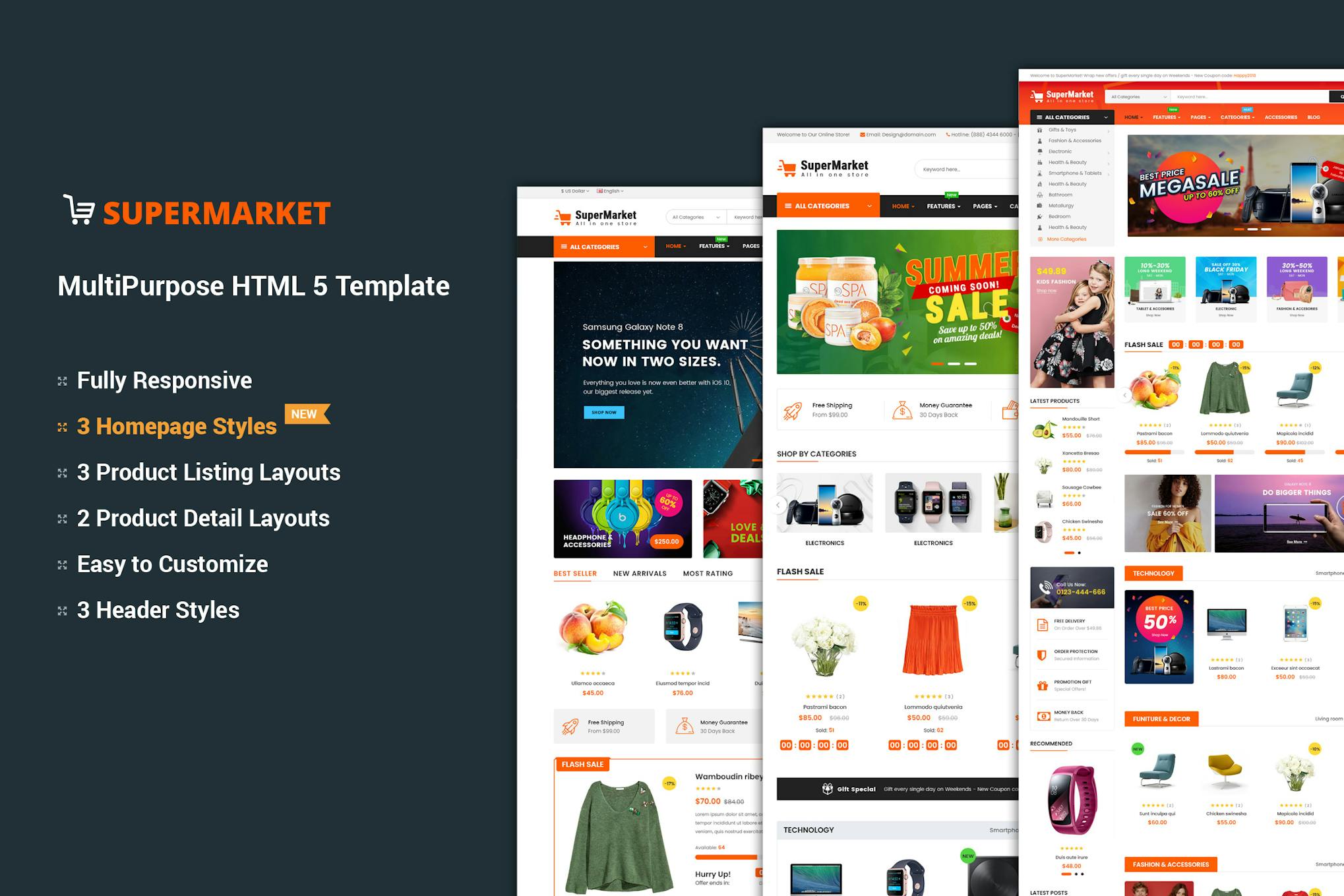 Elevate your online store with SuperMarket HTML, a premium template boasting multiple stunning layouts and advanced features. With three modern homepage options, Bootstrap 3 integration, and clean code, this template offers a seamless user experience. Features like Product Quick View, Mega Menu support, and responsive design ensure a professional and customizable online shopping experience. Explore limitless possibilities for your online store with SuperMarket HTML.