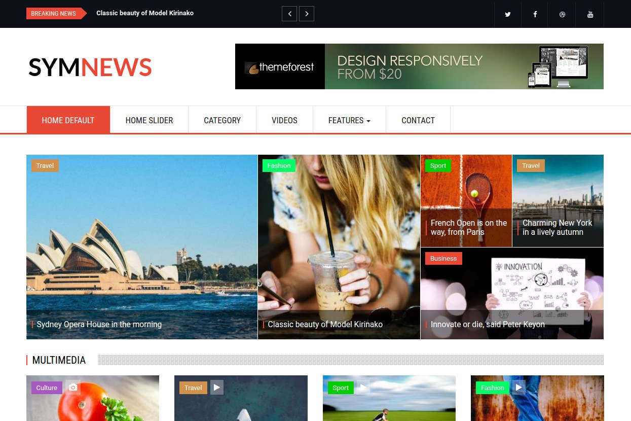 SymNews is a cutting-edge news and magazine Drupal theme that boasts an elegant design, making it suitable for both traditional multi-category magazines and modern thematic news portals. With two stylish homepage options – Default and Slider styles – users can tailor their website to suit their content preferences. The theme also supports photo formats through the stunning Juicebox plugin and allows for seamless video embedding from popular sources like YouTube and Vimeo, with the option to configure additional video platforms. Additionally, users can create unlimited news categories for a comprehensive content organization, and leverage multiple authors with individual profiles for a personalized touch. SymNews offers 7 pre-defined color schemes, all supported by Bootstrap 3, ensuring a seamless user experience. Overall, SymNews excels in providing a visually appealing and user-friendly platform for news and magazine websites.
