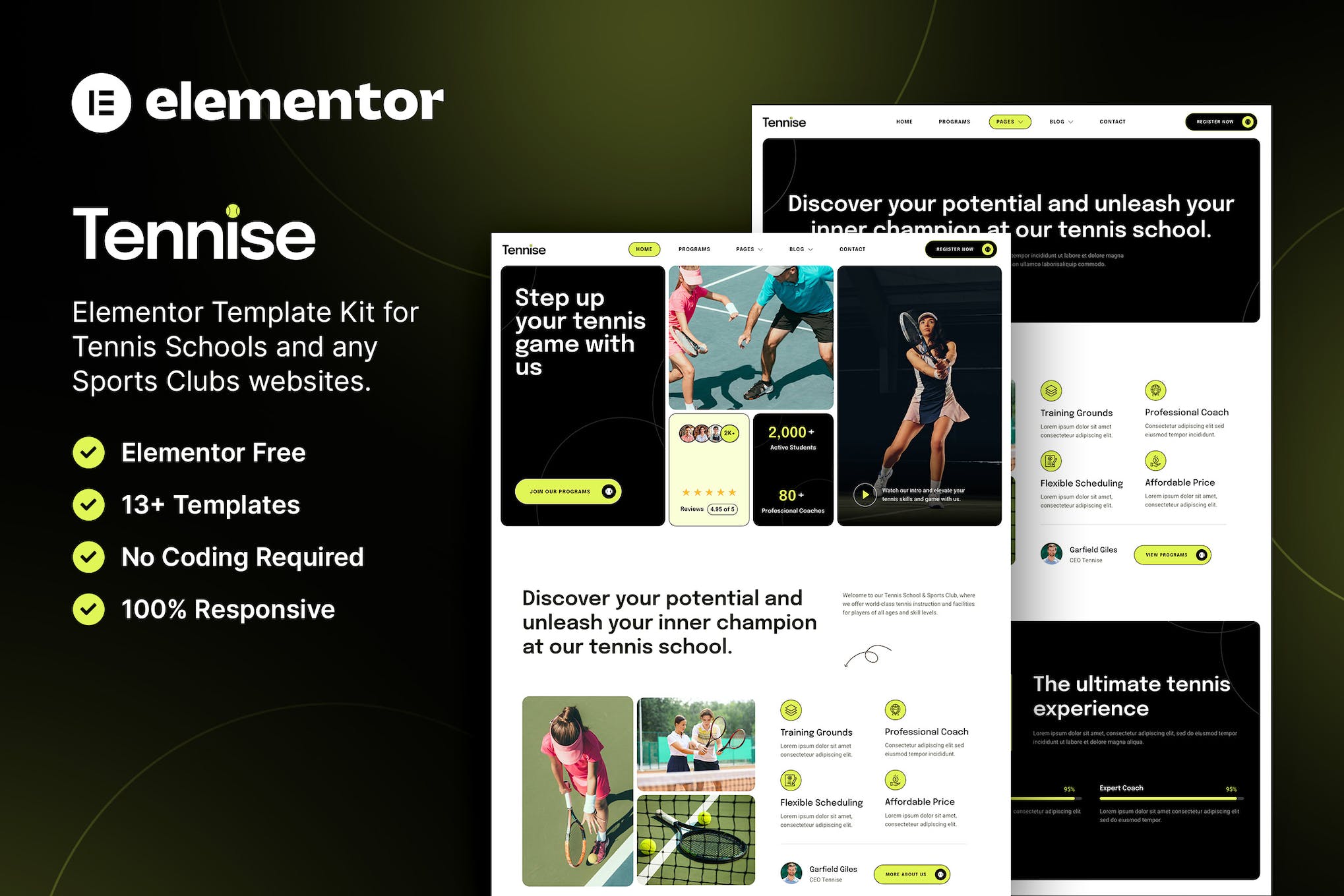 Introducing Tennise – the ultimate Elementor Template Kit designed specifically for tennis schools and sports clubs. With its modern and sporty design, Tennise offers a fully responsive layout, making it the perfect choice for creating a stunning website. The kit includes 13+ carefully crafted and responsive templates, which are customizable using Elementor’s easy-to-use drag-and-drop interface. Whether you’re an academy, coach, or sports center, Tennise has everything you need to create a professional and visually appealing website.