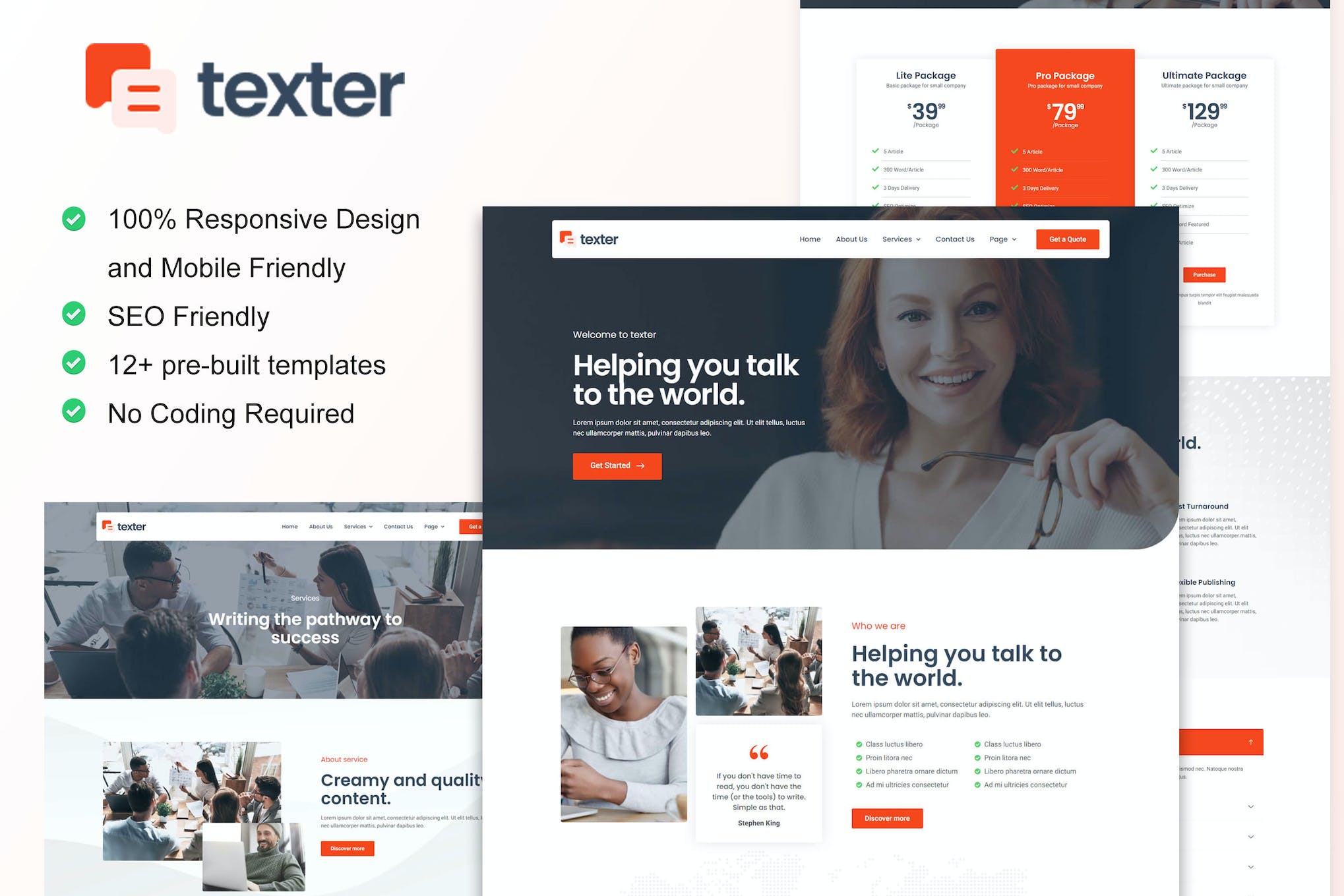 Introducing Texter, the ultimate Elementor template kit for copywriting and content writing businesses. With its 12 pre-built templates featuring modern design and professional style, you can easily create a stunning website to showcase your services. This kit is fully responsive and customizable, giving you the flexibility to tailor it to your specific needs. Upgrade to Elementor Pro to unlock additional templates and features. Start building your content writing empire today with Texter.