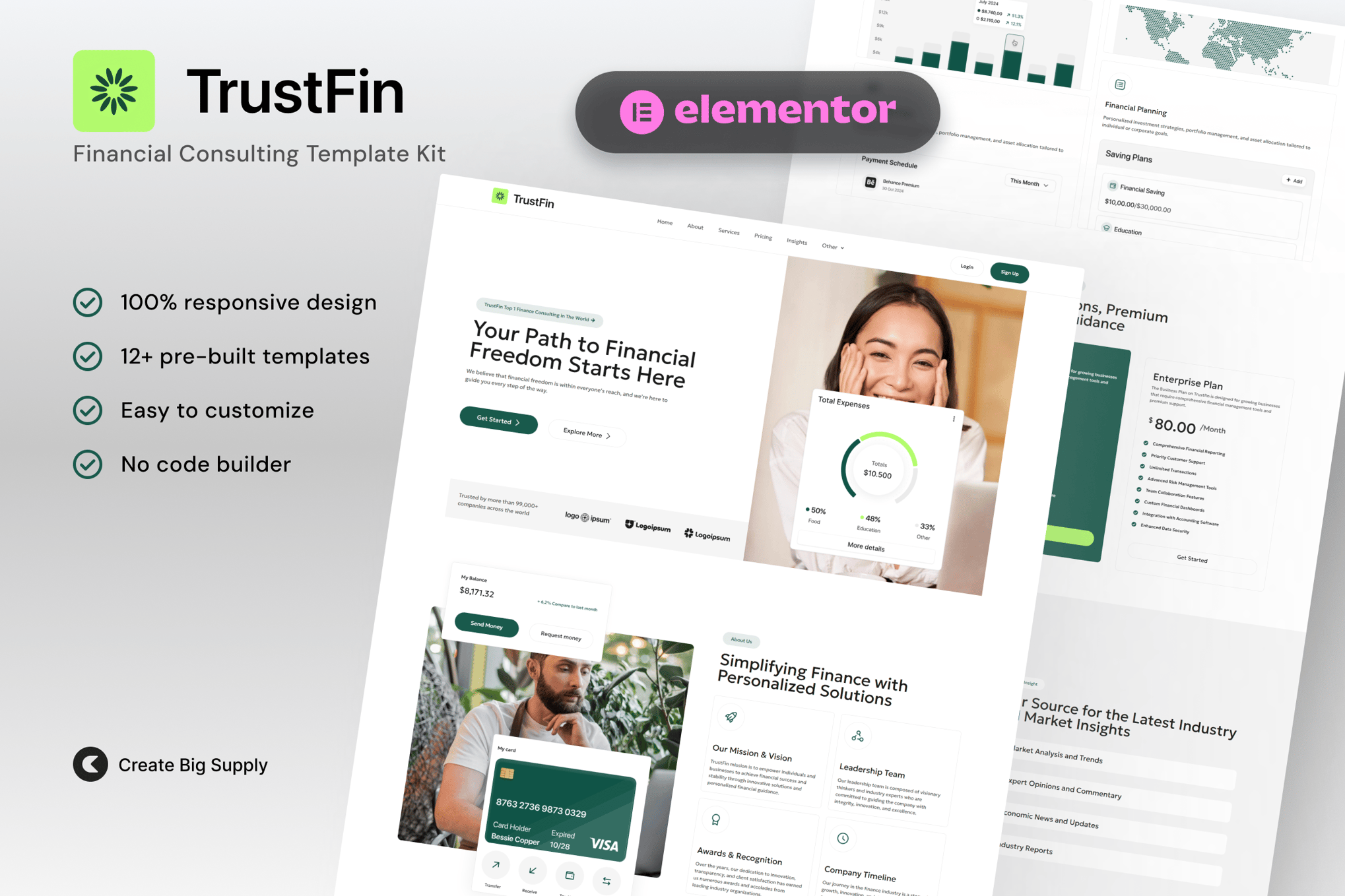 The Elementor template kit is tailored for financial consulting firms seeking to elevate their online presence. With 12 pre-designed page templates, this kit enables you to effortlessly showcase services, team members, and client testimonials. The clean and professional design instills trust in potential clients, while features like SEO optimization and mobile responsiveness ensure a seamless user experience. Additionally, the kit offers sections for pricing plans, an insightful blog, and customizable inquiry forms. Compatible with popular browsers and easily customizable, this kit is a must-have for consultants aiming to establish credibility in the digital landscape.