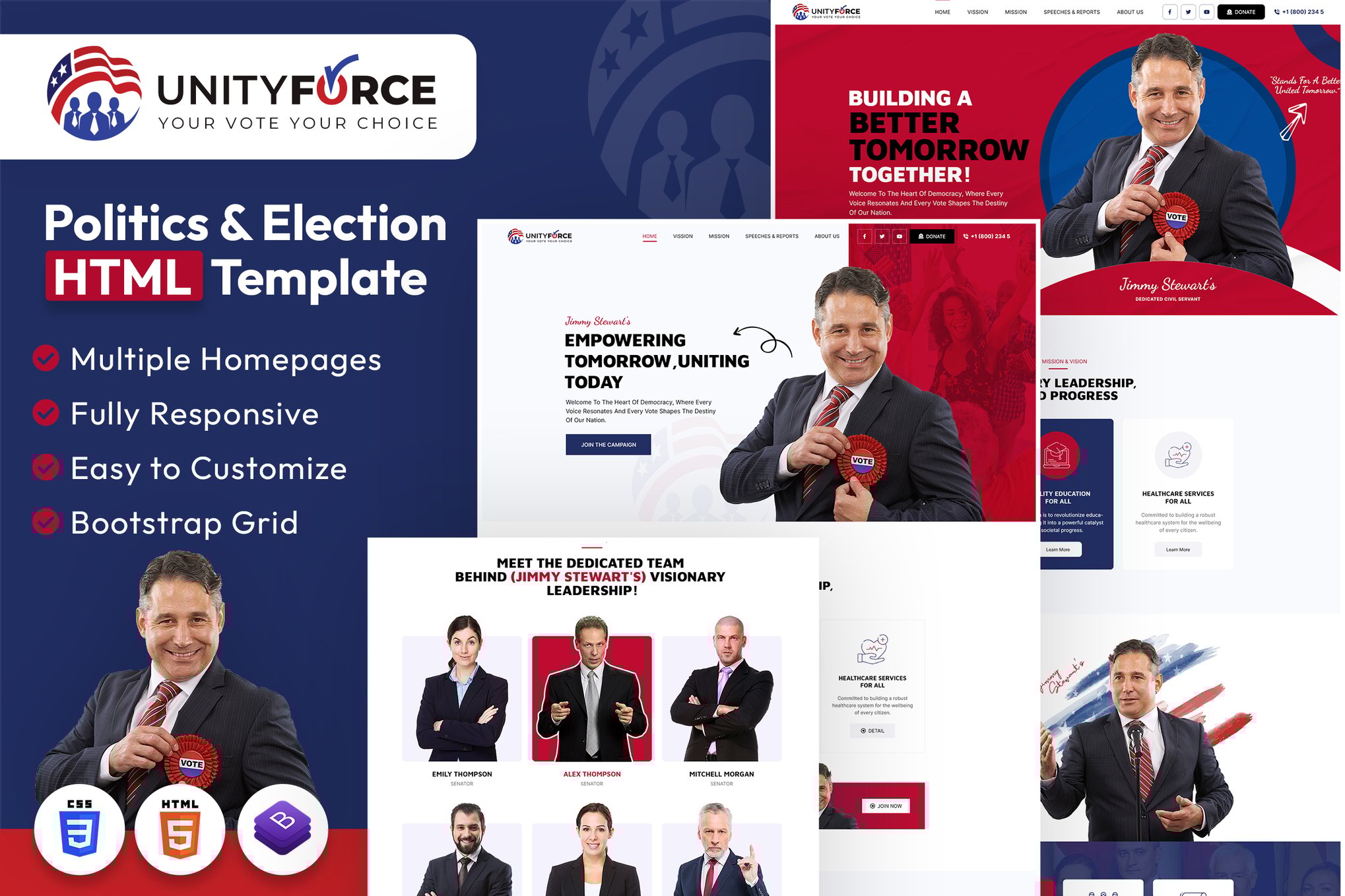 Introducing Unity Force HTML Template: a versatile platform designed specifically for political candidates and campaigns to establish a strong online presence. With its responsive design, the template ensures seamless accessibility across all devices, enabling candidates to connect with voters effectively. From detailed campaign overviews to interactive features encouraging supporter engagement, Unity Force empowers candidates to showcase their vision and values creatively. The template’s modern aesthetic, high-quality visuals, and interactive elements create an immersive browsing experience. Enjoy the flexibility to customize grids, sliders, and color schemes to reflect your unique identity. With easy editing instructions provided for HTML and CSS files, as well as tips for utilizing color schemes and animations, Unity Force offers a user-friendly solution to elevate your campaign strategy and engage with your audience effectively.