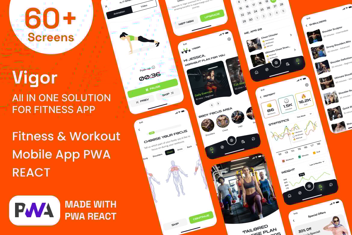 Revolutionize your gym’s mobile presence with Vigor – a feature-rich PWA mobile app template designed to boost user engagement and enhance fitness experiences. With over 60 well-designed screens and comprehensive customization options, Vigor enables you to create a tailored platform for gym-goers to access workout plans, track progress, and build community connections. Utilizing PWA technology, Vigor ensures a seamless app experience on all devices while reducing development costs. Enhance user experiences, increase gym visibility, and start empowering your users to achieve their fitness goals today. Download Vigor now and start building a dynamic fitness platform!