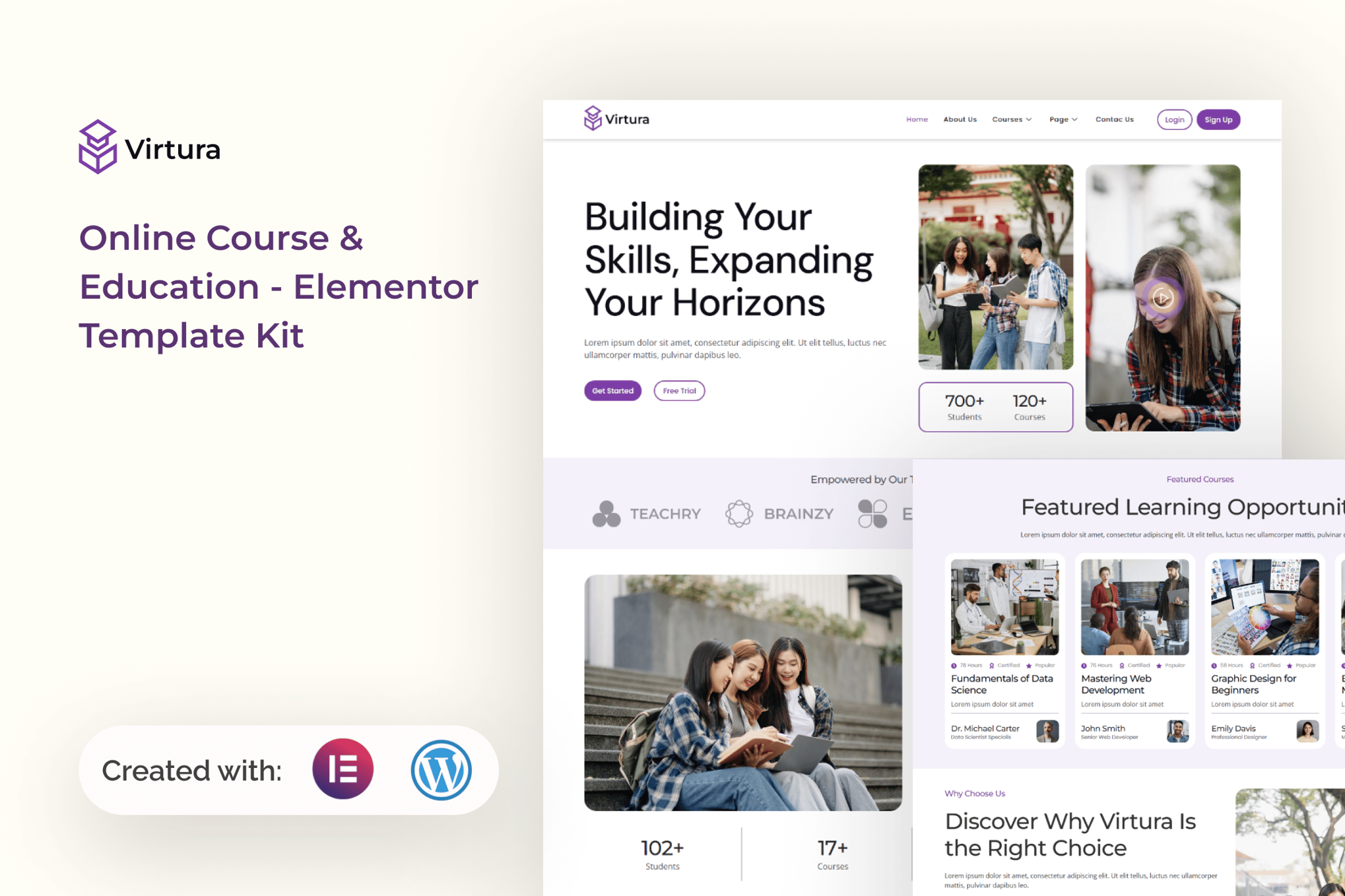 Virtura Template Kit is a modern and versatile solution tailor-made for online course creators, educational institutions, tutors, and e-learning platforms. Specifically designed for WordPress and seamlessly integrated with Elementor, this kit enables users to effortlessly build a professional website without any coding skills. The kit offers a plethora of features including a unique and modern design, 15 ready-to-use pages, unlimited color options, 900+ ready fonts, and cross-browser compatibility. With templates for various sections like Home, Our Course, Pricing Plan, and Contact Us, Virtura ensures a comprehensive and visually appealing web presence. Users can easily set up global headers and footers and import Metform blocks for added customization. For further details and support, users can refer to the detailed guide provided by MAH Studios.