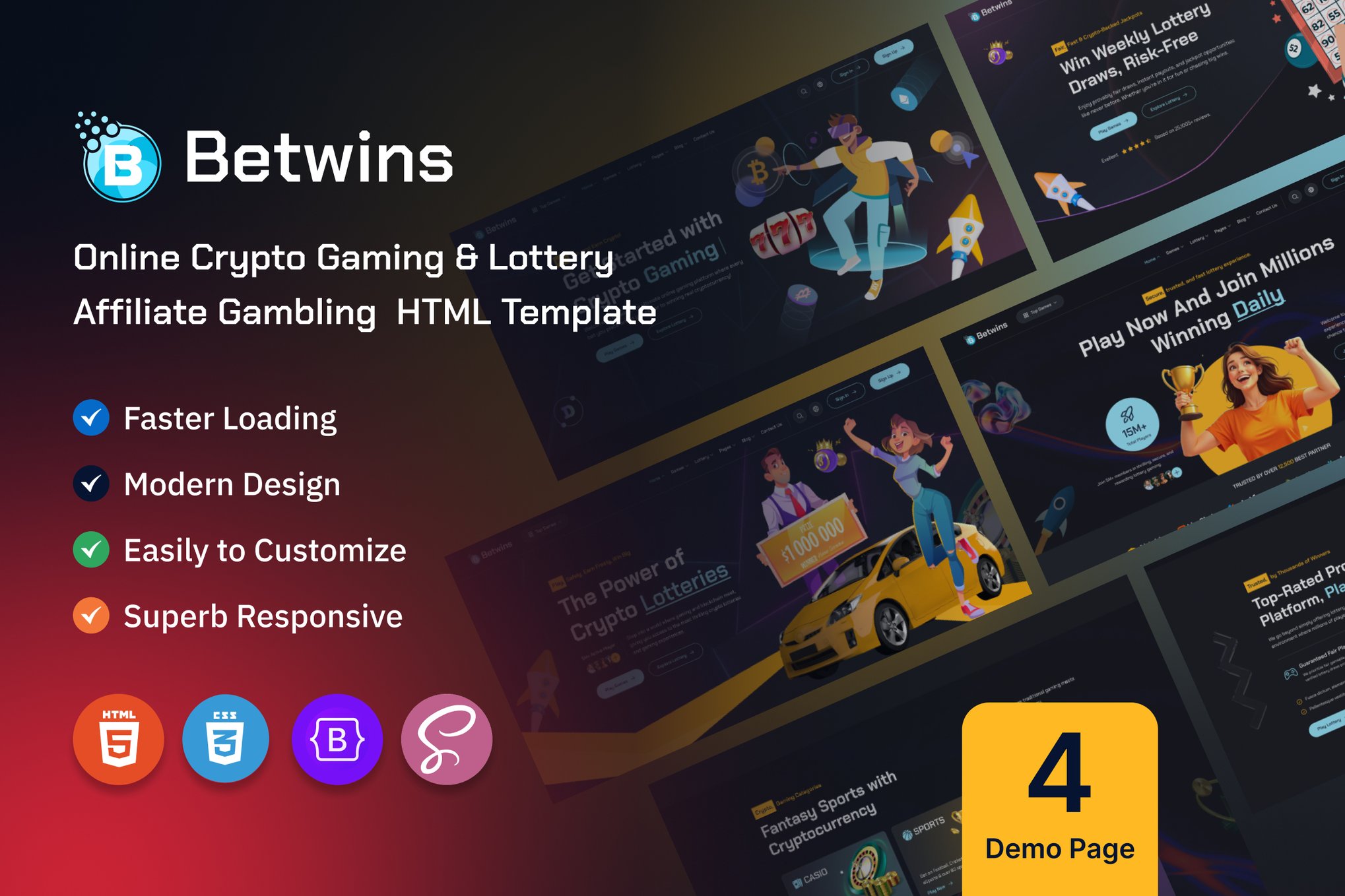 Introducing Betwins – a sophisticated HTML template tailored for crypto gaming, online casinos, sports betting, and affiliate gambling sites. With its modern design, seamless user experience, and full responsiveness, Betwins is the ultimate foundation for launching a crypto-based gaming platform or online betting portal. Packed with features like crypto payment support, affiliate gambling integration, and customizable sections for lottery and gaming, Betwins ensures high performance and easy customization. Ideal for various websites, including crypto casino platforms, online lottery portals, and affiliate gambling sites, Betwins is your go-to solution for a professional and engaging online presence.