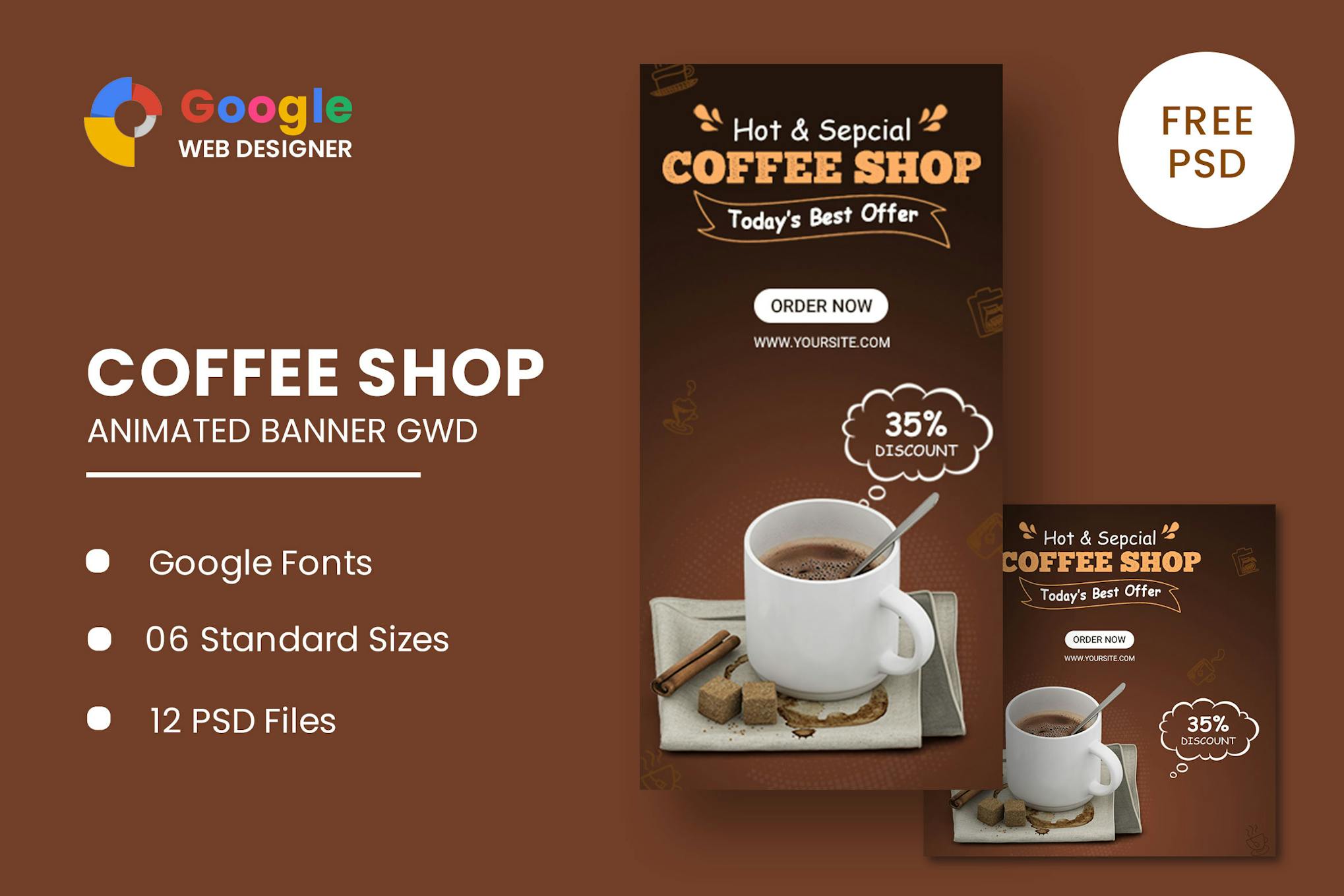 Elevate your coffee shop’s online presence with the Coffee Shop Animated Banner set designed for all business purposes. This professional set includes 6 standard sizes for versatility and features HTML5/CSS3 effects for a dynamic touch. Easy to customize using Google Web Fonts and Google Web Designer, this package includes 6 HTML ad templates and 12 PSD banner templates to make your marketing efforts seamless. Give your coffee shop the spotlight it deserves with these eye-catching banners.