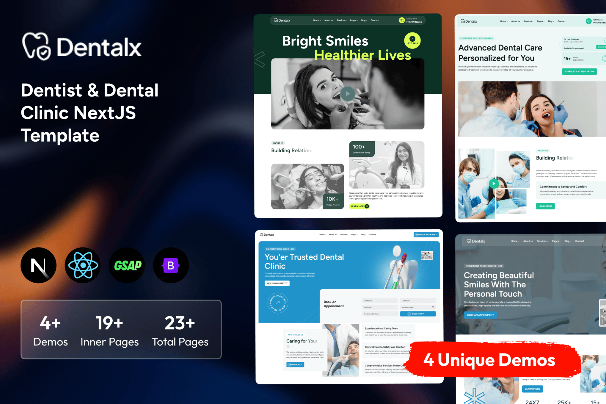 Elevate your dental clinic’s online presence with DentalX NextJS, a modern and dynamic template tailored for healthcare professionals. Featuring multiple homepage designs, responsive layouts, and a suite of interactive elements, this template is designed to captivate patients and boost your practice’s visibility. With seamless integration of booking forms, service showcases, and testimonial carousels, DentalX NextJS provides a comprehensive solution for showcasing your services effectively and engaging with your audience. Built with cutting-edge technologies like React, TypeScript, and Bootstrap, this template ensures a user-friendly experience and optimized performance for your website.