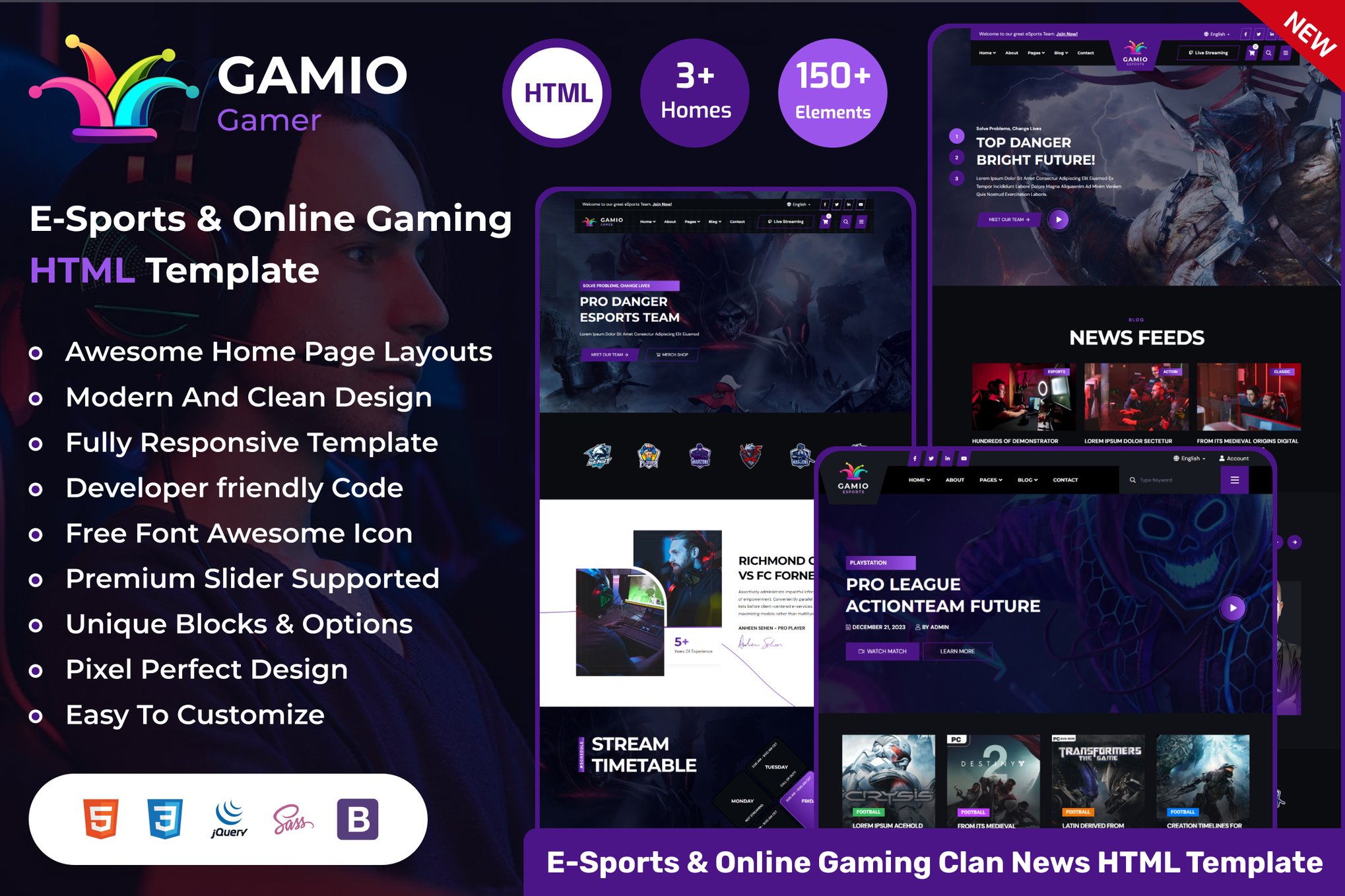 Gamio – eSports and Gaming HTML5 Template is a versatile choice for e-Sports, Gaming News, Clan Page, and Online Game Portal websites. With a clean and modern design, this template offers a powerful platform to showcase your gaming content. It includes essential pages like About Us, Clan, Game News, Team, FAQ, Pricing Plans, Testimonials, Games, Galleries, News, Contacts, and more. Gamio is developer-friendly, lightweight, and fast, with W3 validated source code, making it easily customizable and extendable. The template features 3+ unique home page layouts, modern design, specially designed inner pages, a wide range of UI elements, and blocks. It is built on Bootstrap 5 and SASS for a responsive and mobile-optimized design. Other standout features include an E-Commerce page template, shop-ready pages, a premium layer slider, free Font Awesome icons, smooth transition effects, dedicated support, and detailed documentation. Gamio is compatible with all major browsers and offers a pixel-perfect design and creative layouts for a seamless user experience.