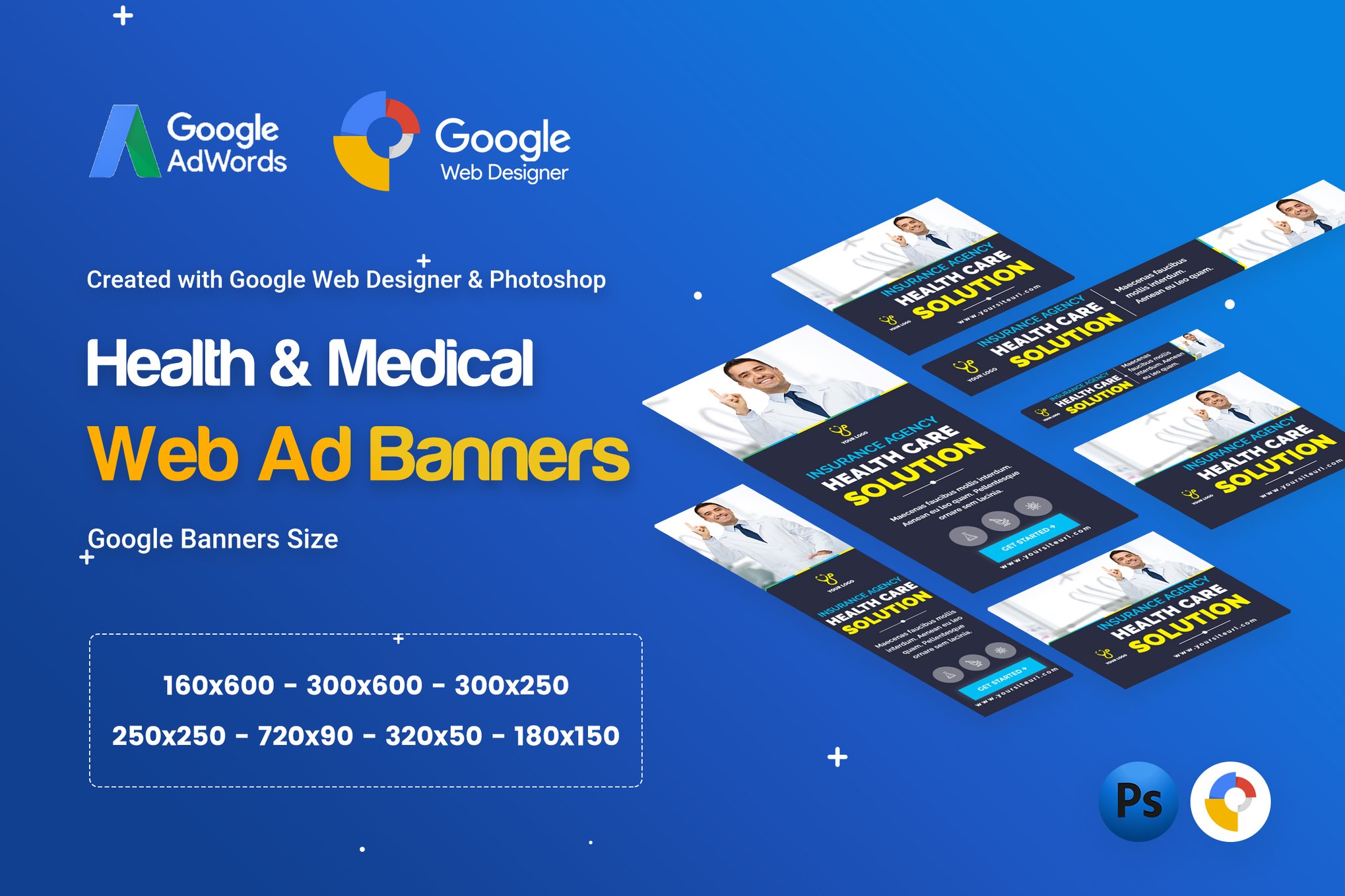 Enhance your medical agency’s online presence with our Medical Agency Banners Ads Template. This collection features 7 unique PSD and HTML templates designed with the latest material design trends. Fully editable layers allow you to customize colors and text effortlessly. Utilize Google Ad Sizes for optimal reach. Stand out with professional banners that resonate with your target audience. Fonts used are Raleway and Montserrat for a modern and sleek look. Please note that the displayed images are not included in the main download package. Elevate your medical branding with these eye-catching banners today.