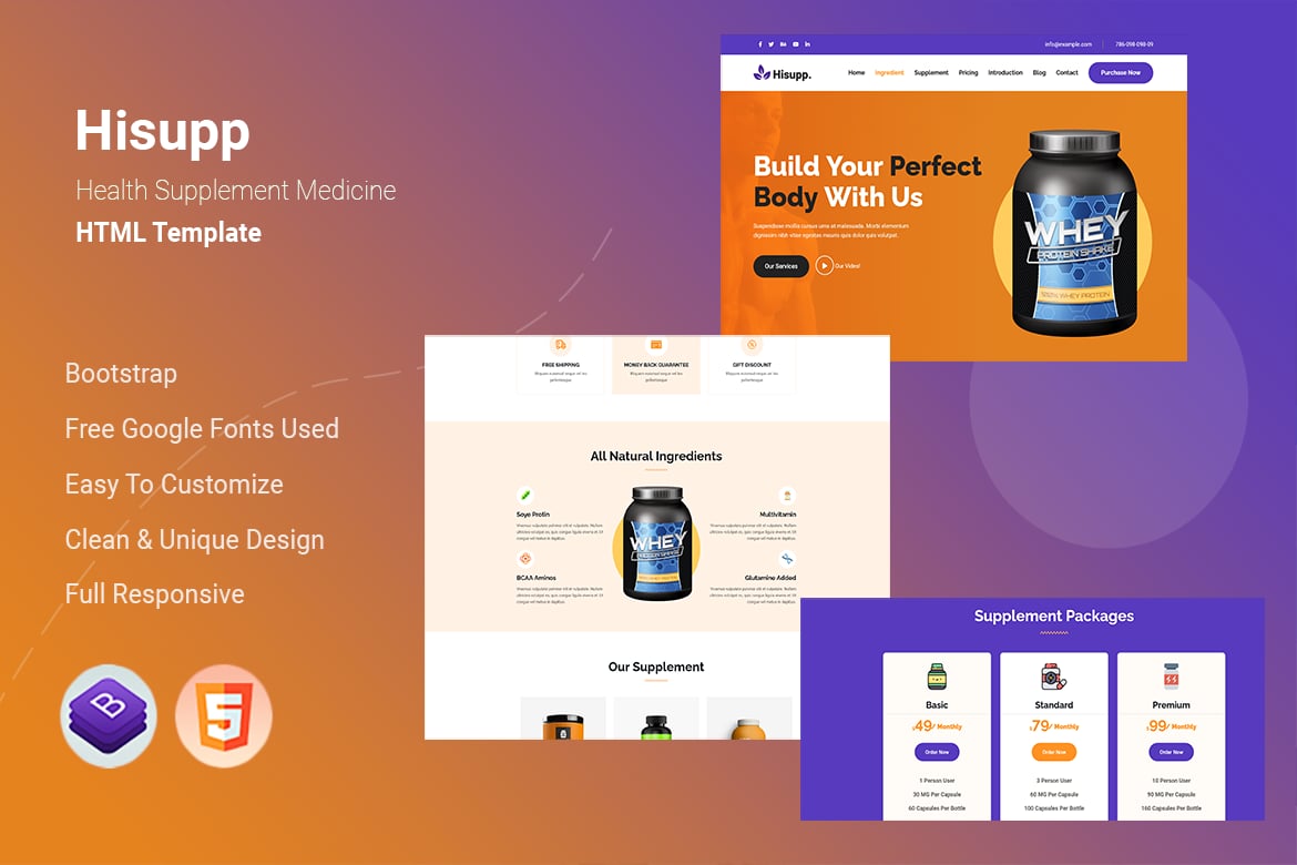 Introducing Hisupp Health Supplement Medicine Landing Page Template, expertly crafted for Supplement, Medicine Affiliate, Body Enhancement, Weight Loss, and Diet products. This comprehensive template includes a fully responsive design, based on Bootstrap 5.x, with a dynamic homepage, 5 inner pages, and captivating WOW animations. Built with HTML5 & CSS3 and featuring 360+ icons, Hisupp is designed for easy customization, ensuring a clean layout, sticky header, and retina-ready display. Elevate your business website with Hisupp’s professional and user-friendly interface.