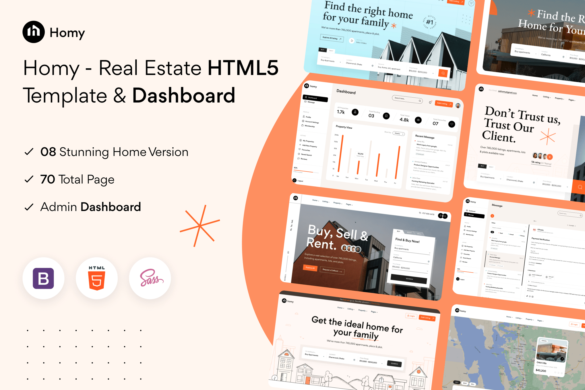 Presenting Homy – a sophisticated Real Estate HTML5 Template perfect for modern property websites. With its sleek design and advanced features, Homy effortlessly showcases properties with stunning visuals, ensuring an exceptional user experience. This template offers responsive layouts, client testimonials, inquiry forms, blog integration, and agent profiles, making it an ideal choice for real estate professionals and agencies looking to establish credibility and connect with potential clients. Additionally, Homy comes with a powerful dashboard panel, offering seamless control over your admin operations. With a wide range of features and easy customization options, Homy is the go-to choice for creating a professional and engaging online presence in the real estate industry.
