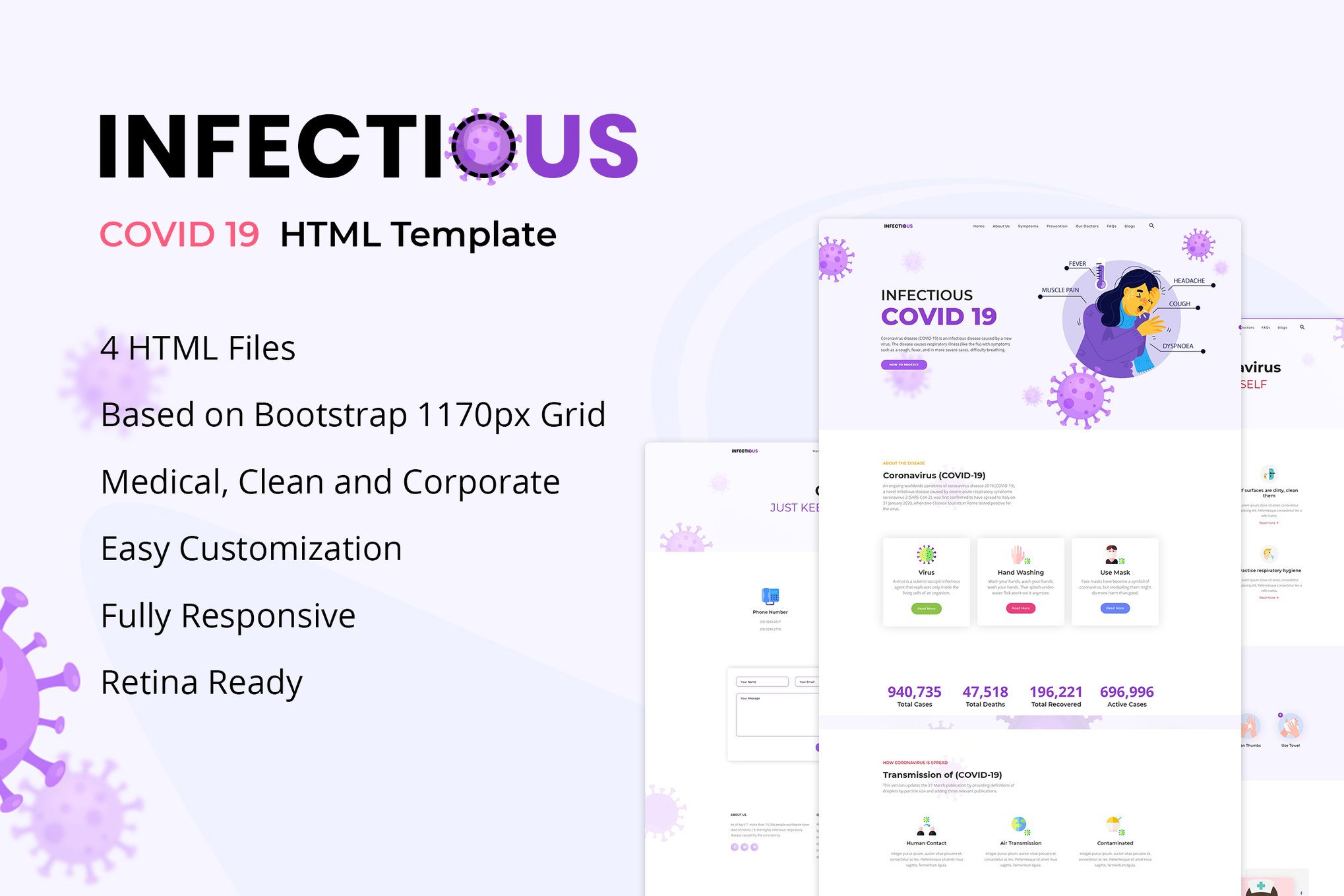 Introducing Infectious, a highly responsive Covid-19 Medical Prevention HTML template designed for health professionals and organizations. This versatile template is ideal for addressing various diseases, including coronavirus and medical viruses. With a sleek one-page layout featuring dedicated sections for prevention, about us, and contact, Infectious offers a grid-based design that adapts beautifully to screens of all sizes. Fully customizable and complete with a Slick Slider, this template is a comprehensive solution for creating an informative and impactful online presence.