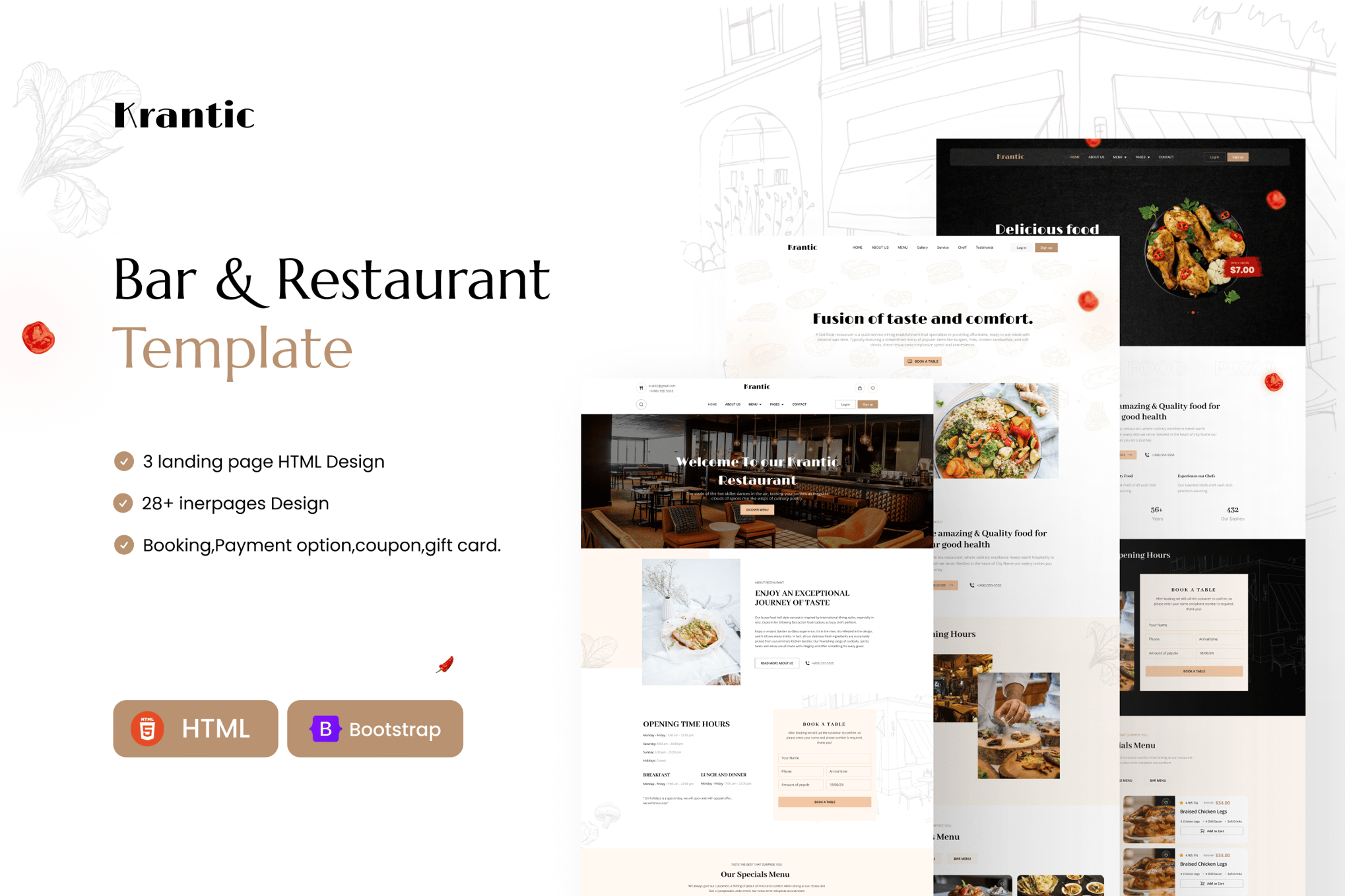 Krantic is a versatile Bar & Restaurant HTML5 Template designed for European cuisine, bakeries, burgers, chefs, diners, and more. With 03 Homepage Versions and 31 Total Pages, this template offers a unique and modern design built with Bootstrap 5.0.2 & SASS, ensuring responsiveness on all devices. The template features clear layouts, customizable options, W3 validation, Google Fonts, and Font-Based Icons. It includes pages for menus, reservations, blogs, and user profiles, among others. Enjoy great customer support, and easily edit the template to suit your needs. With files included for easy setup, Krantic is the perfect choice for showcasing your food-related services globally.