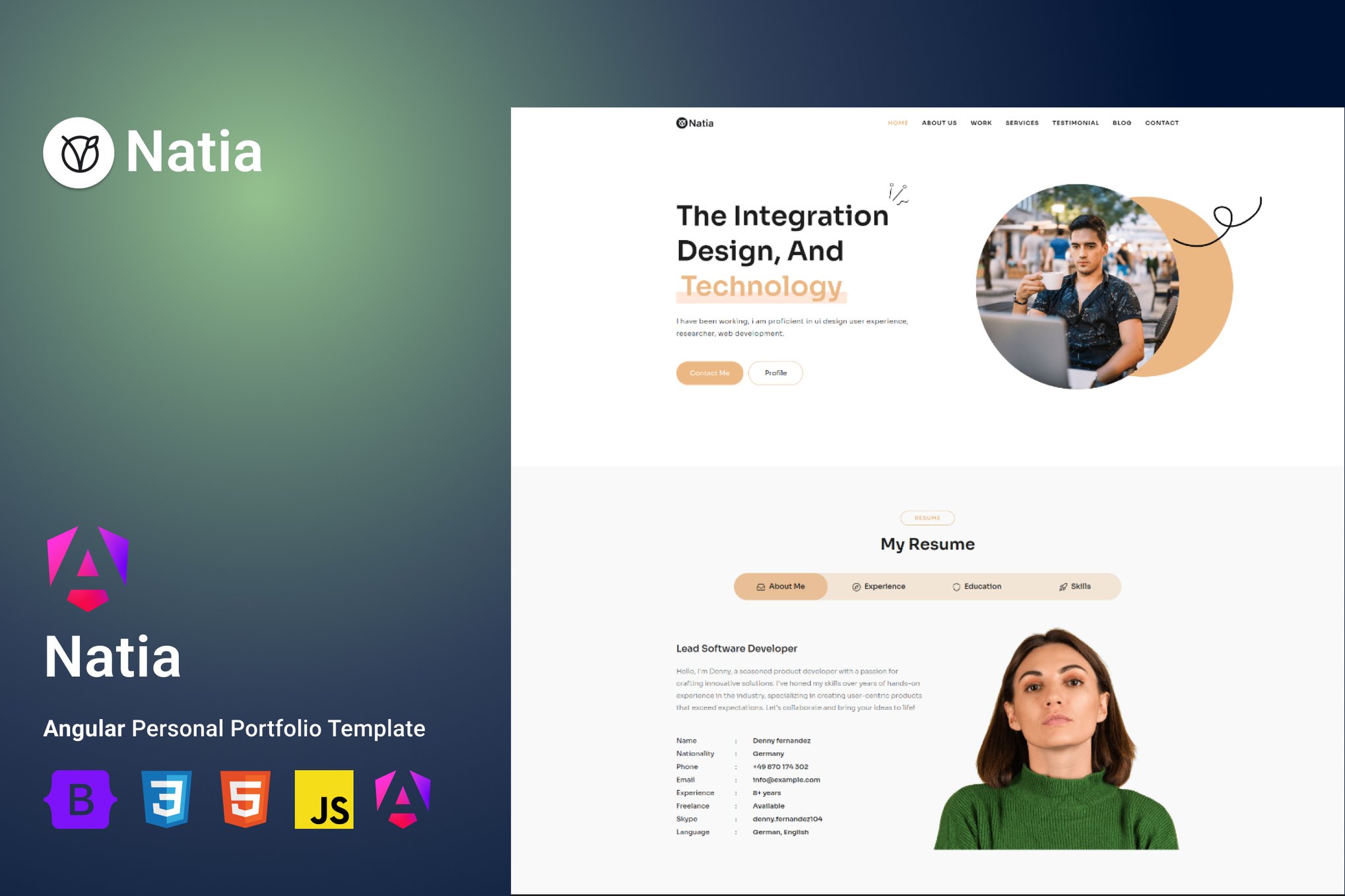 Natia – Personal Portfolio Angular 19 Template is a modern and responsive solution tailored for showcasing personal resumes and portfolios in a professional manner. Ideal for creative professionals, freelancers, and developers, Natia boasts a clean, modular code structure built on Bootstrap v5.3.3 and Angular v19. Offering easy customization, responsive design, and extensive features like Google Fonts and W3C Valid Markup, Natia ensures a seamless and visually appealing online presence for individuals seeking a standout portfolio platform with a user-friendly experience. Tailored layouts and comprehensive customization options make Natia an effortless choice for designers, developers, and artists aiming to create a unique online portfolio with ease.