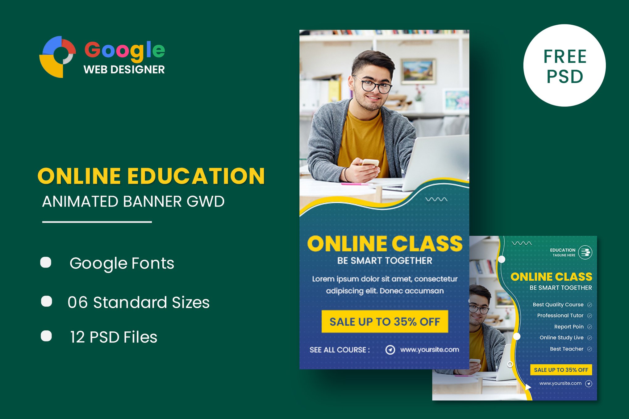 Introducing Online Class Animated Banner GWDis a professional set of banner templates designed for various business needs. With 06 standard sizes and HTML5/CSS3 effects, these banners are versatile and visually appealing. Easily customizable using Google Web Designer and Google Web Fonts, this package includes 06 HTML Ad templates and 12 PSD Banner templates. Enhance your online presence with these eye-catching banners and captivate your audience effectively.