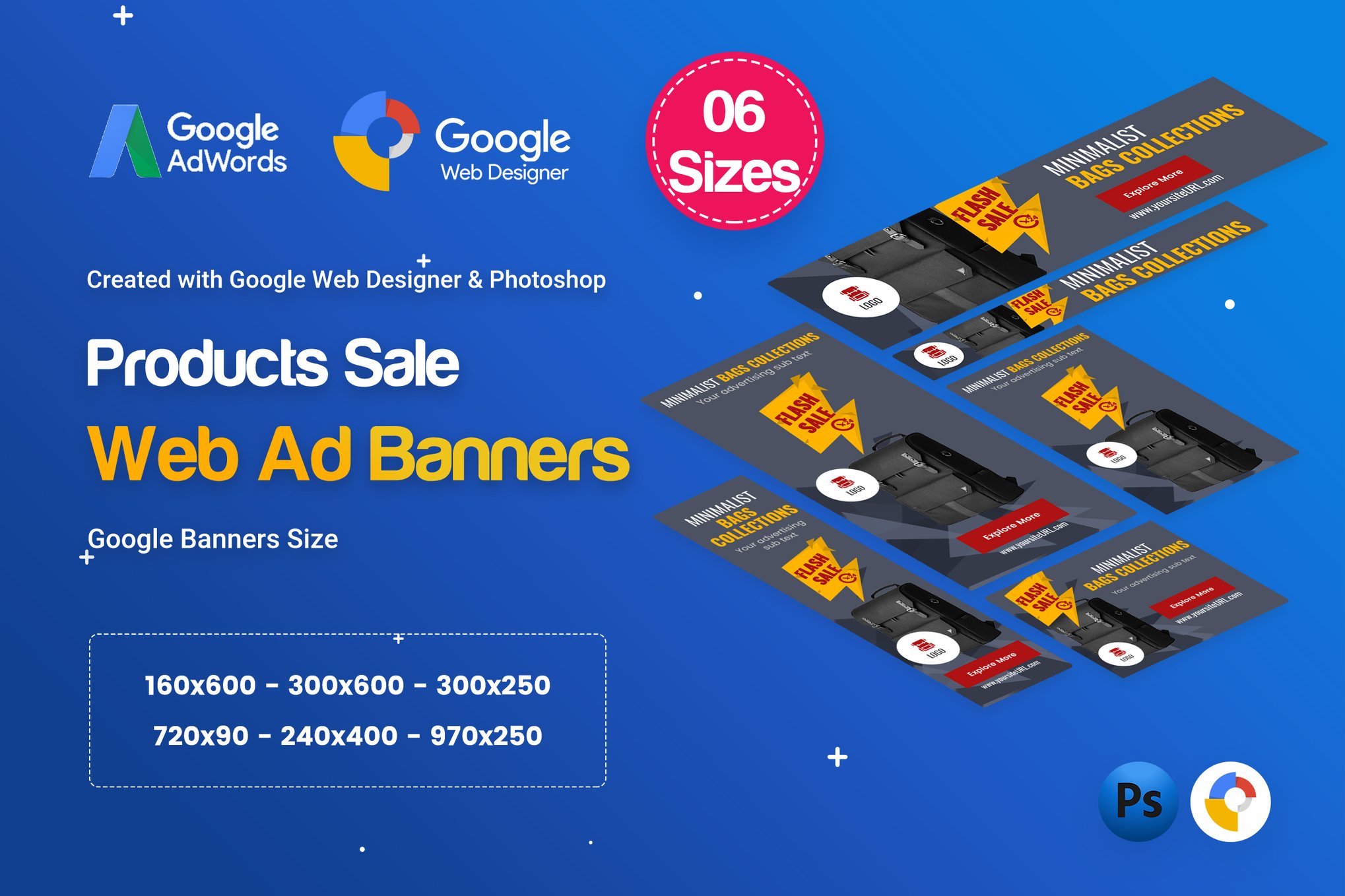 Presenting our Products Sale Banners Ad PSD Template, a clean and uniquely designed set ideal for showcasing promotions, marketing initiatives, and online sales. This collection features six template PSD files and six template HTML5 files, each crafted with the latest material design trends. With Google Ads sizes included, these banners offer easy customization options with layered files and editable colors and text. Elevate your sales strategy with these professional and eye-catching banners today.