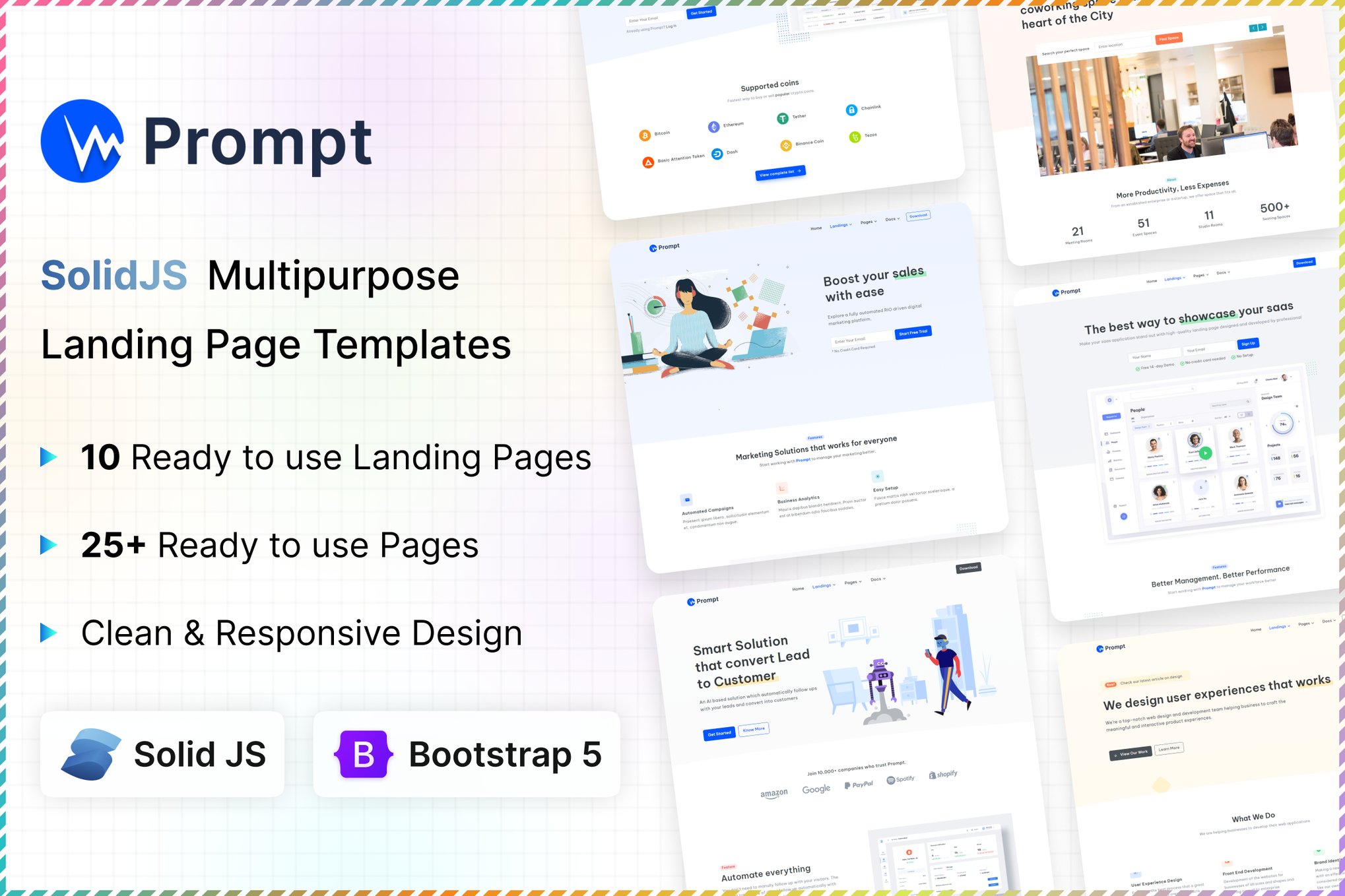Introducing Prompt, a versatile multi-purpose template featuring a modern design and built on SolidJS and Bootstrap 5.3.3. Ideal for creating mobile-first, responsive landing pages, and websites. The clean, well-commented code makes customization a breeze, allowing easy updates to content, images, and SCSS for a personalized touch. With 10 diverse landing page options and a range of features like Admin Dashboard pages, web app templates, and a responsive layout, Prompt is an excellent choice for businesses seeking a professional online presence.