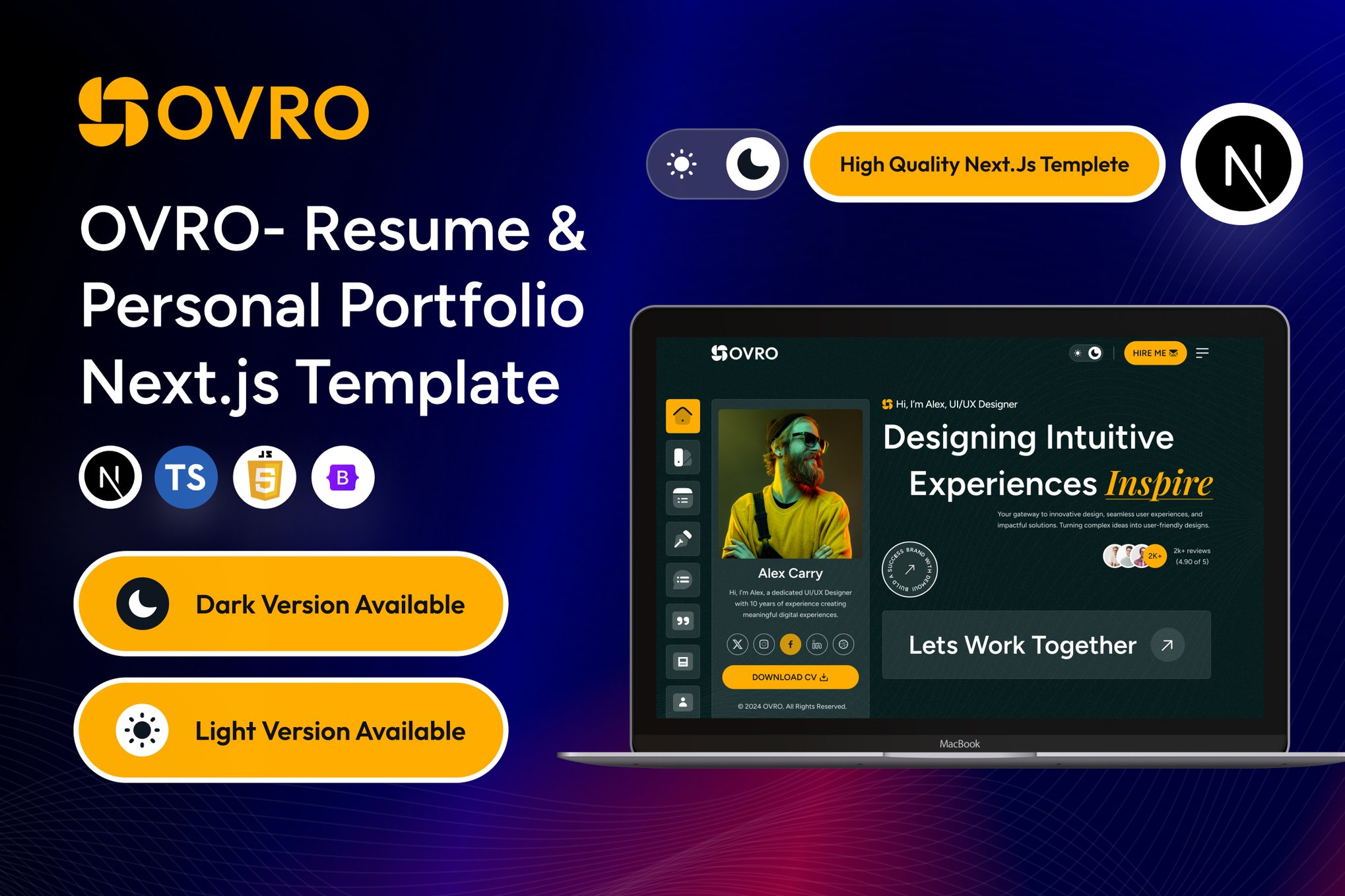 Introducing Ovro, the Resume & Personal Portfolio Next.js Template packed with exceptional features. Designed for simplicity, this template offers modern aesthetics, stylish subscription and contact forms, and full responsiveness across all devices. Ideal for professionals such as Designers, Developers, Freelancers, and more, Ovro boasts a utility and component-oriented code architecture using Bootstrap 5 & Next.js 14. Enjoy advanced features like dynamic color schemes, automated workflow with Gulp, dark mode, Font Awesome 6 icons, lightbox pop-ups, and lifetime free updates, all complemented by comprehensive documentation and professional support for a seamless website-building experience.