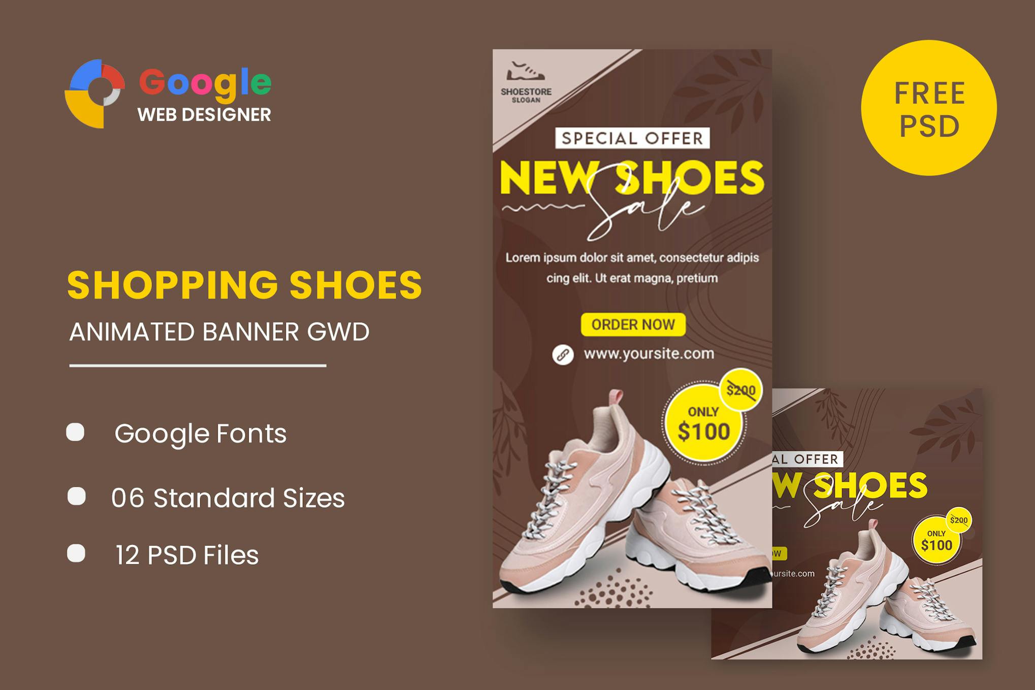 Enhance your advertising campaigns with the Shoes HTML5 Banner Ads for Google Web Designer. This elegant set includes 6 standard sizes and features HTML5/CSS3 effects for a professional touch. With easy editing capabilities and Google Web Fonts integration, these templates are perfect for various business needs. Receive 6 HTML Ad templates, 12 PSD Banner Templates, and the flexibility to customize designs using the free Google Web Designer software. Elevate your marketing visuals effortlessly.