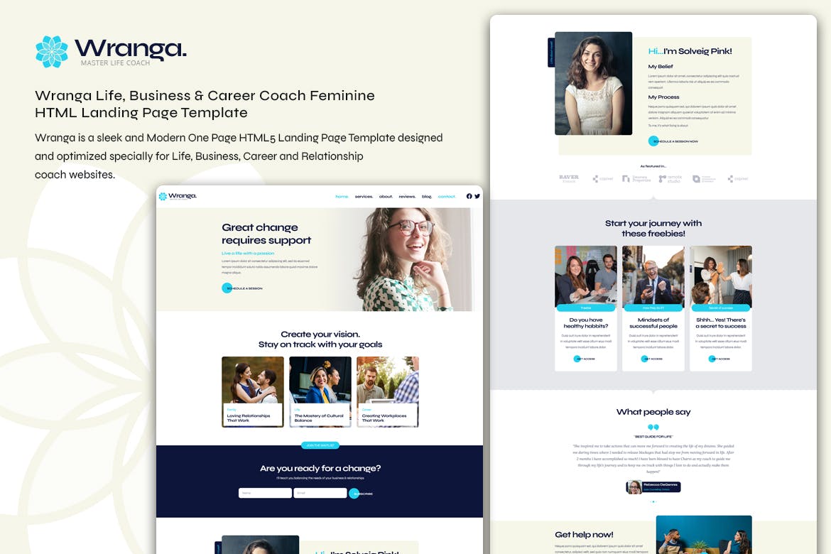 The Wranga Life Coach Feminine HTML Landing Page is a beautifully designed template that perfectly captures the essence of a modern and empowering life coach website. With its clean layout, stunning visuals, and intuitive navigation, it offers a seamless user experience. Whether you’re a life coach or looking to create a personal development website, this landing page is a great choice.