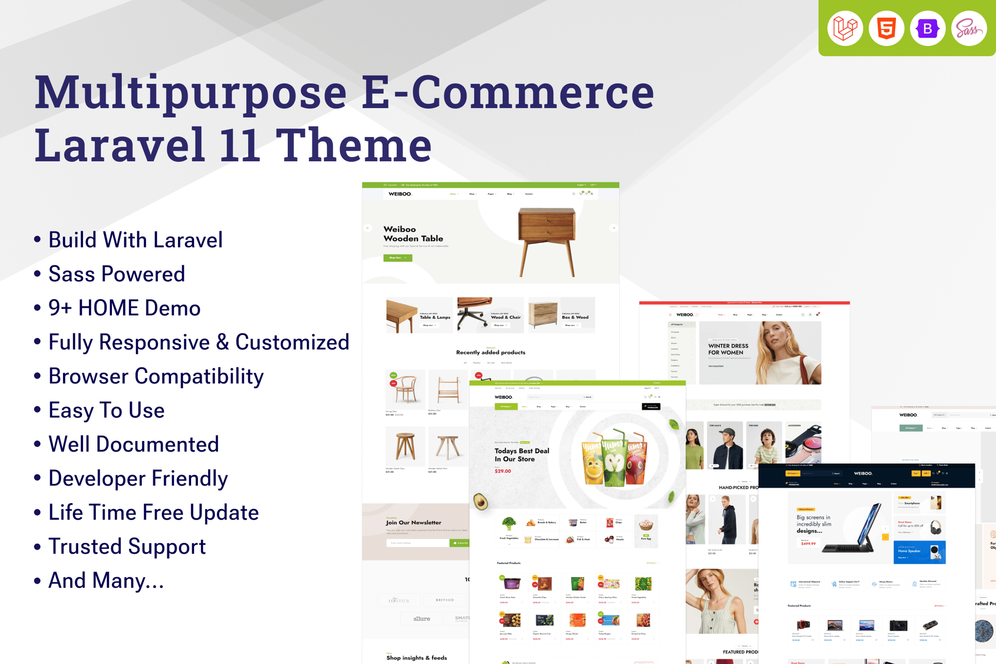 Introducing Weiboo, an exceptional eCommerce Laravel 11 template designed to elevate your online store. Boasting a contemporary aesthetic and a range of unique features, this template is ideal for a variety of eCommerce niches like Fashion, Accessories, Furniture, Electronics, and more. With 10 pre-built home pages and a plethora of inner pages such as shop, cart, and team layouts, Weiboo offers a comprehensive solution for your business needs. The template is responsive, customizable, and includes features like product quick view, sticky menu, and excellent support. Backed by a detailed documentation and crafted with clean code, Weiboo is the ultimate choice for your eCommerce endeavors.